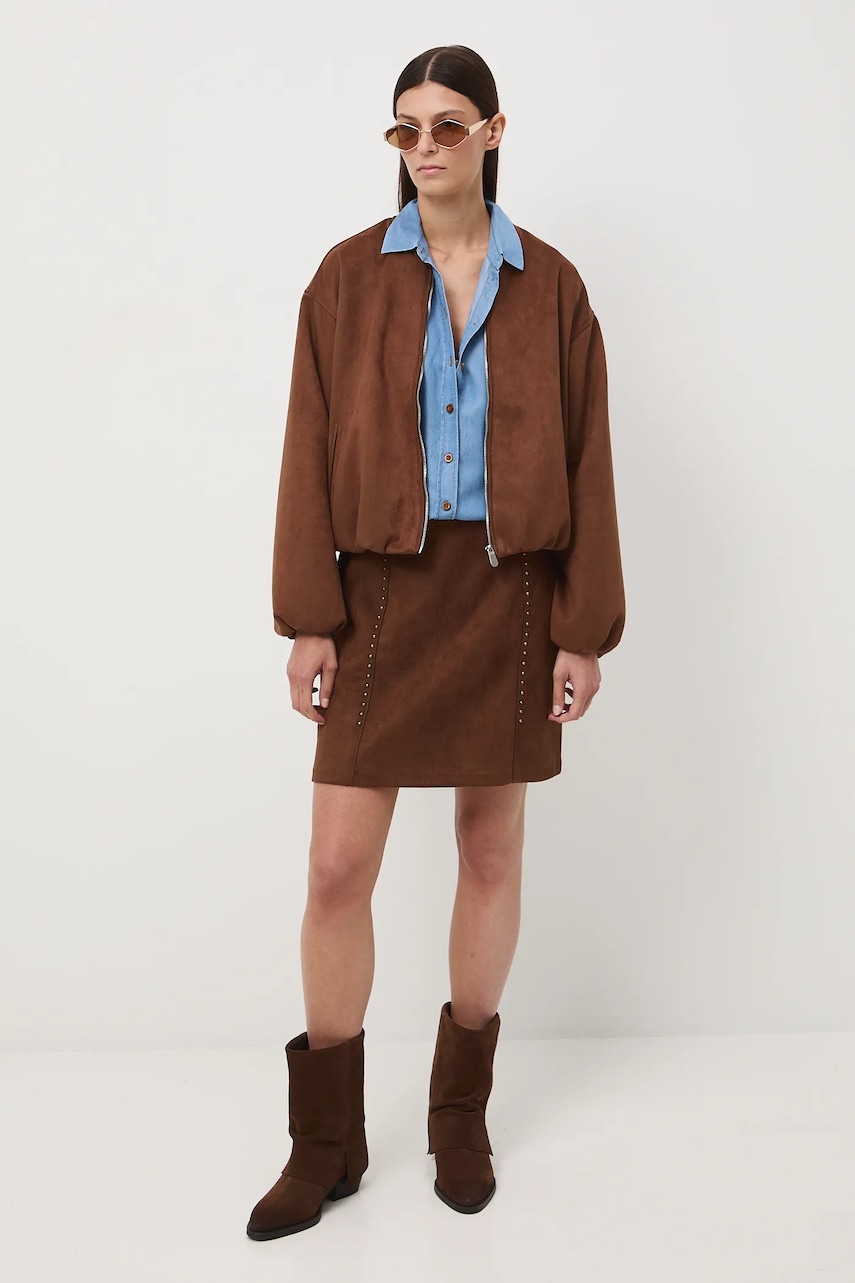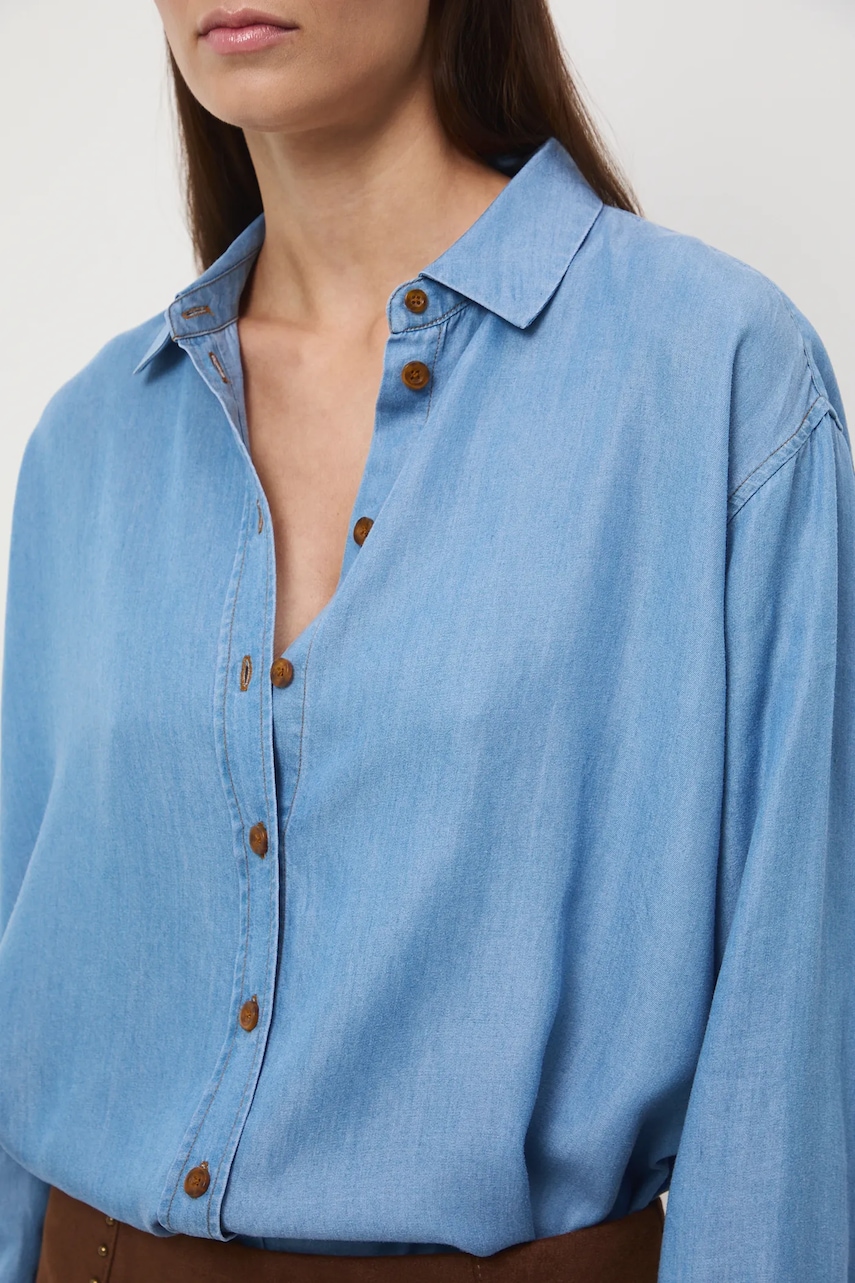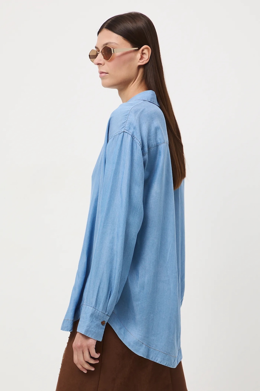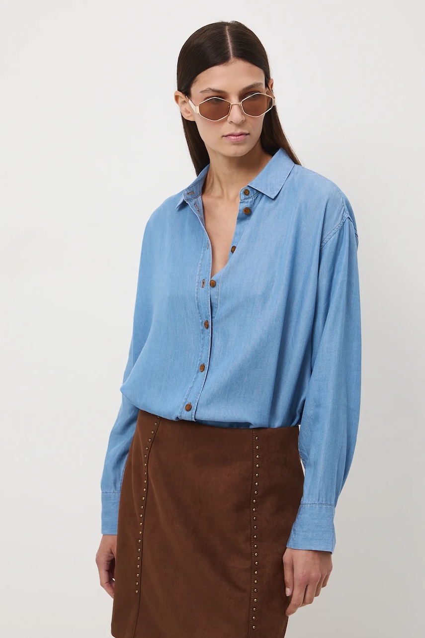 - Fason oversize. - Długi rękaw. - Obniżona linia ramion. - Mankiety zapinane na guziki. - Model z kołnierzykiem. - Zapięcie na guziki. - Gładka tkanina. - Model wykonany z lyocellu. - Tkanina o diagonalnym splocie. - Długość rękawa(mierzona od kołnierzyka): 74,3 cm. - Długość: 74 cm. - Szerokość w biuście: 59 cm. - Wymiary podane dla rozmiaru: S.