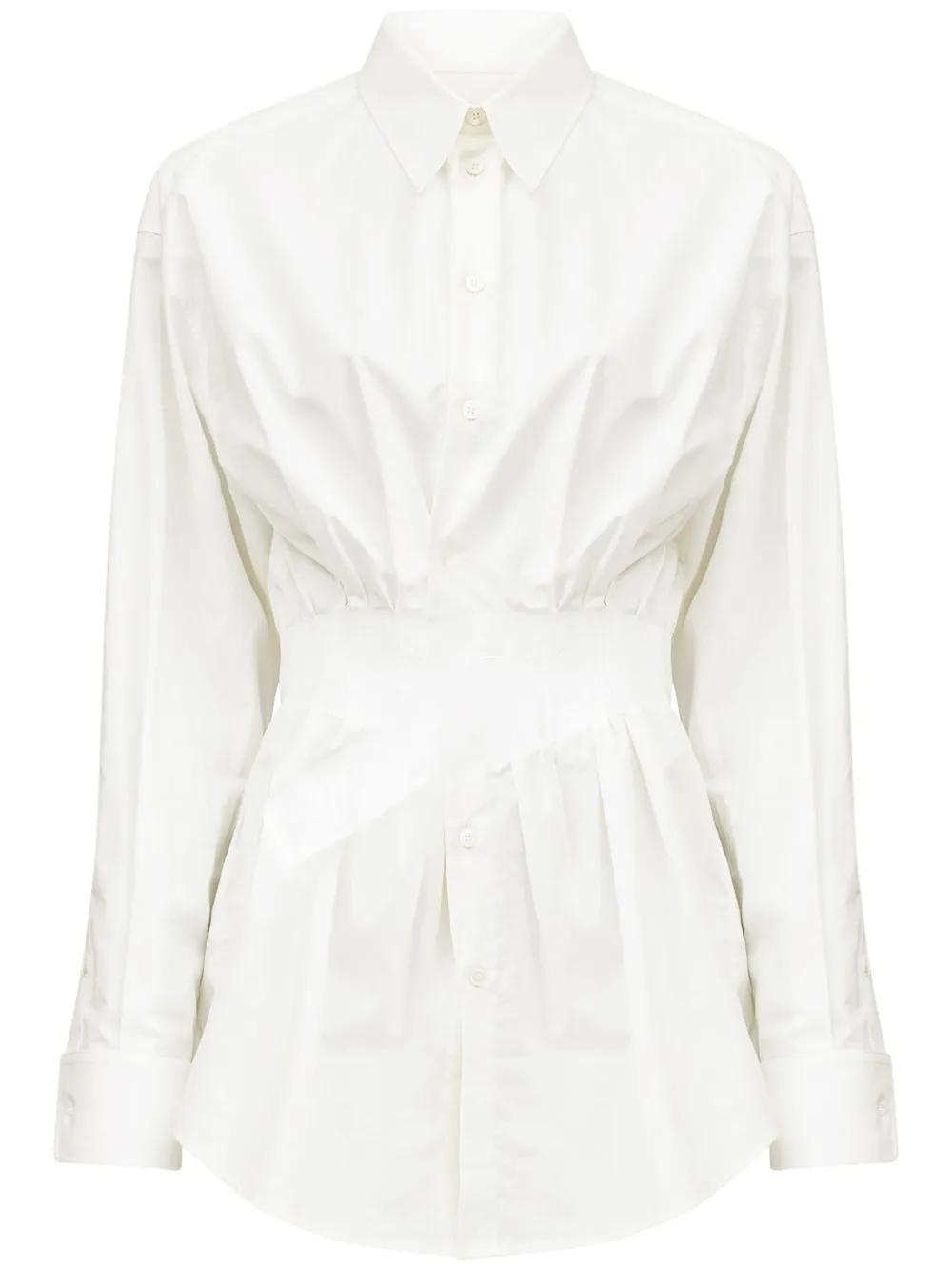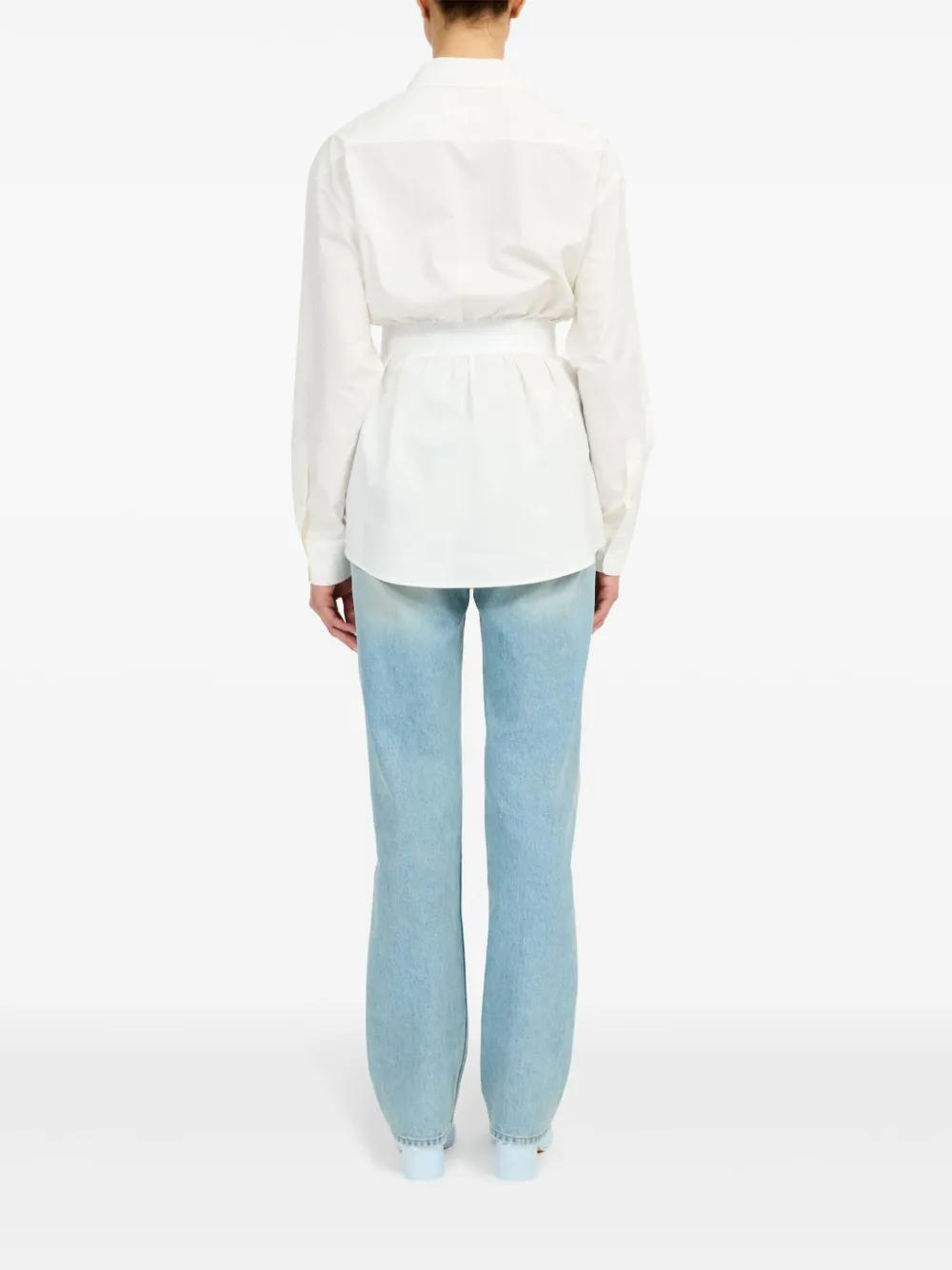 white cotton poplin texture front button fastening straight-point collar drop shoulder long sleeves buttoned cuffs tied waist curved hem