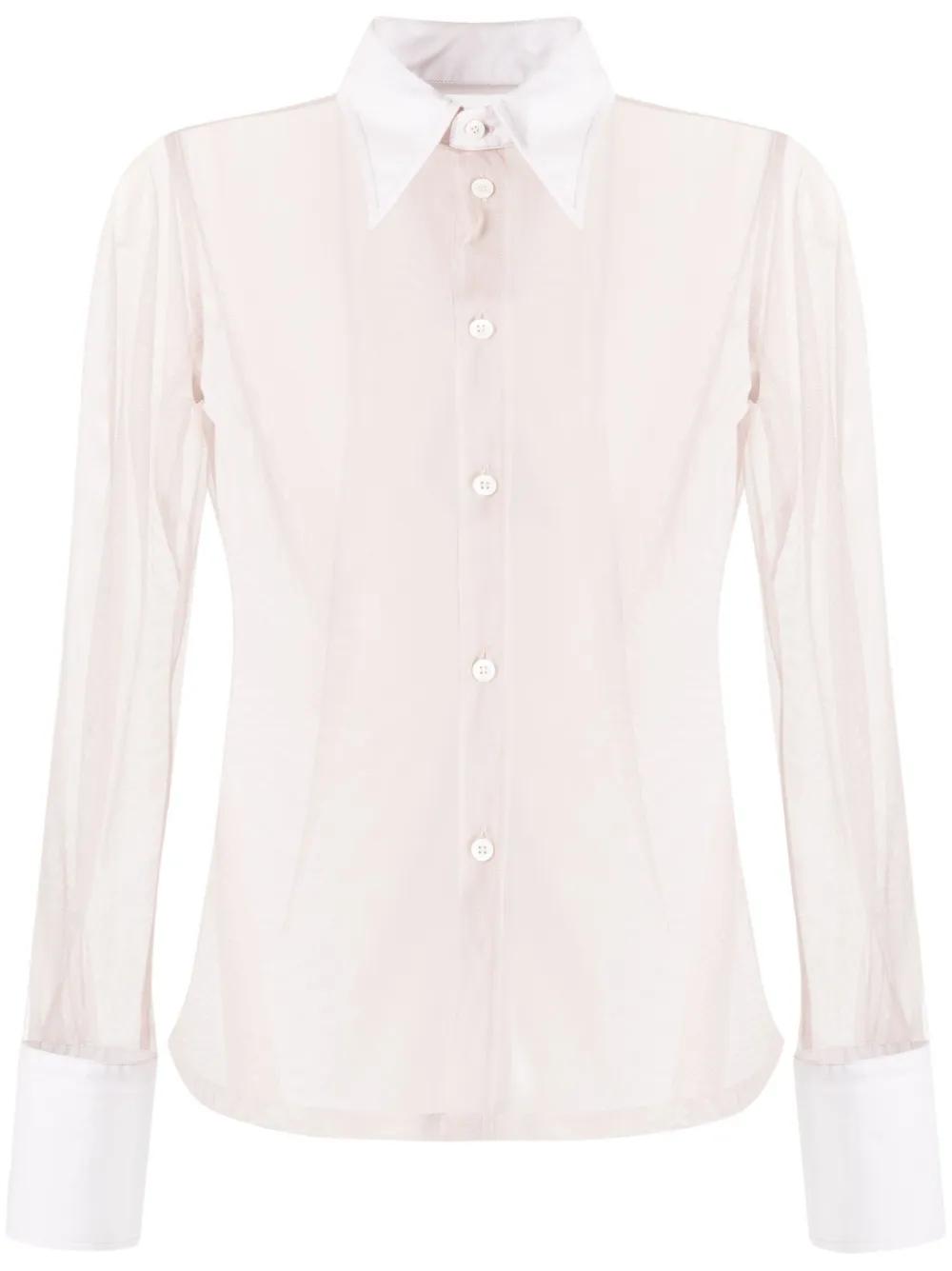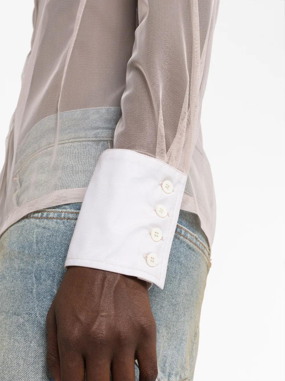 light beige cotton tulle inserts semi-sheer construction pointed flat collar front button fastening long sleeves buttoned cuffs straight hem