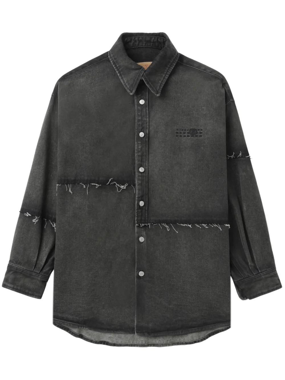 charcoal grey cotton washed denim faded effect panelled design front button fastening classic collar drop shoulder long sleeves frayed detailing signature numbers motif signature single-stitch logo buttoned cuffs curved hem