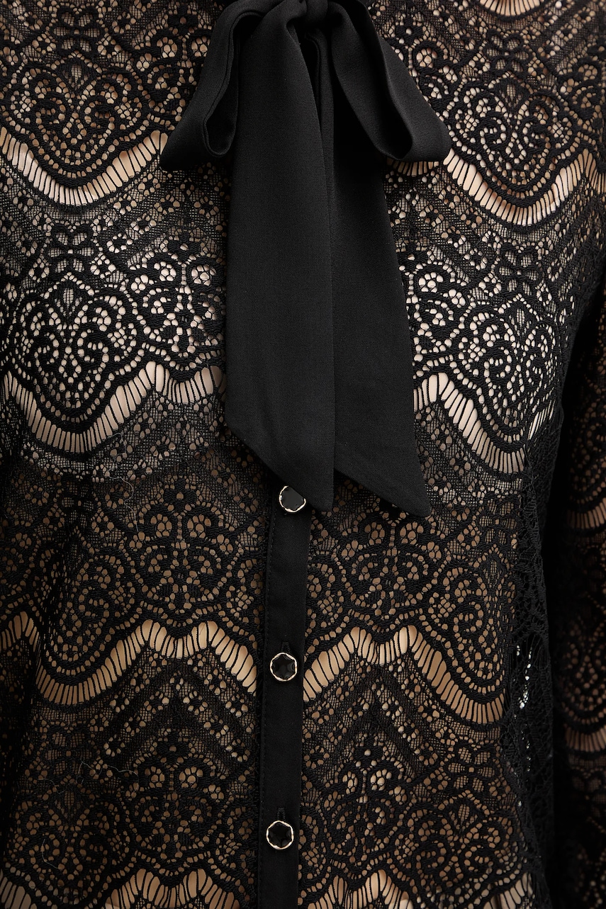 - Prosty fason. - Zapięcie na guziki. - Ozdobne wiązanie przy dekolcie. - Model wykonany z koronkowego materiału. - Długi rękaw. - Długość rękawa: 62 cm. - Długość: 60 cm. - Szerokość pod pachami: 44 cm. - Wymiary podane dla rozmiaru: S.
