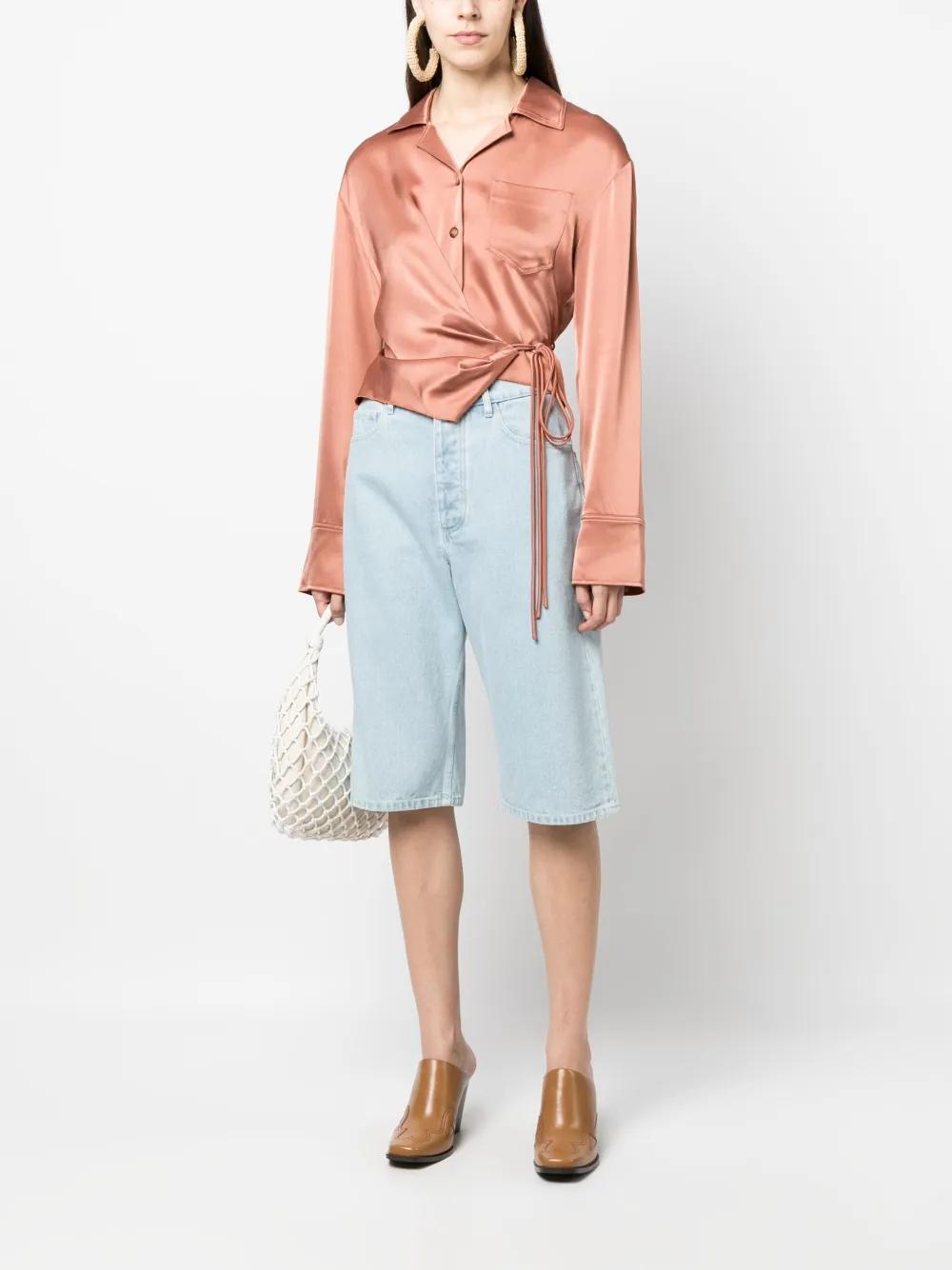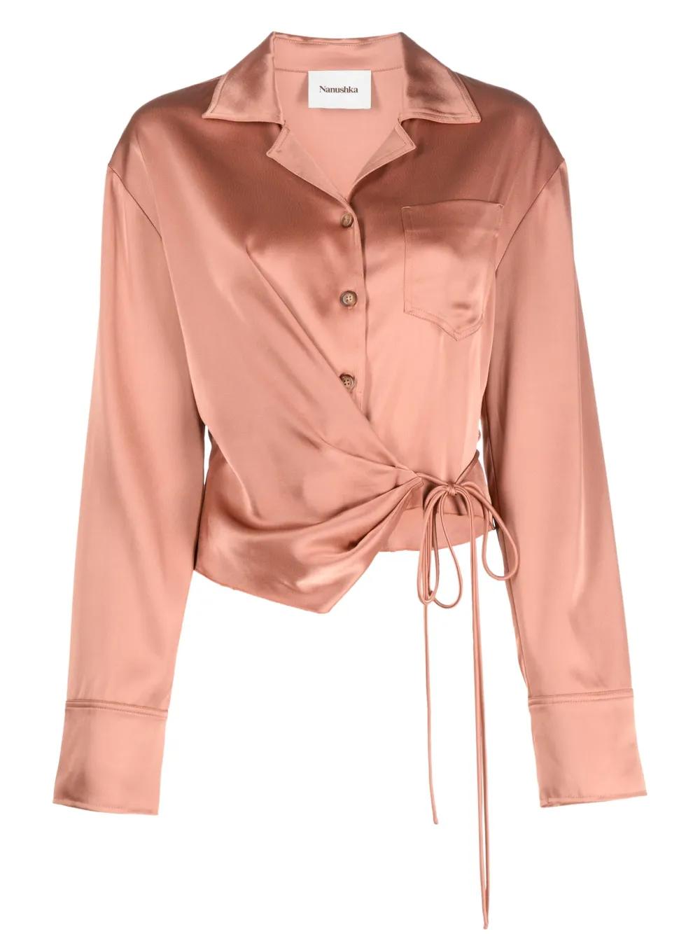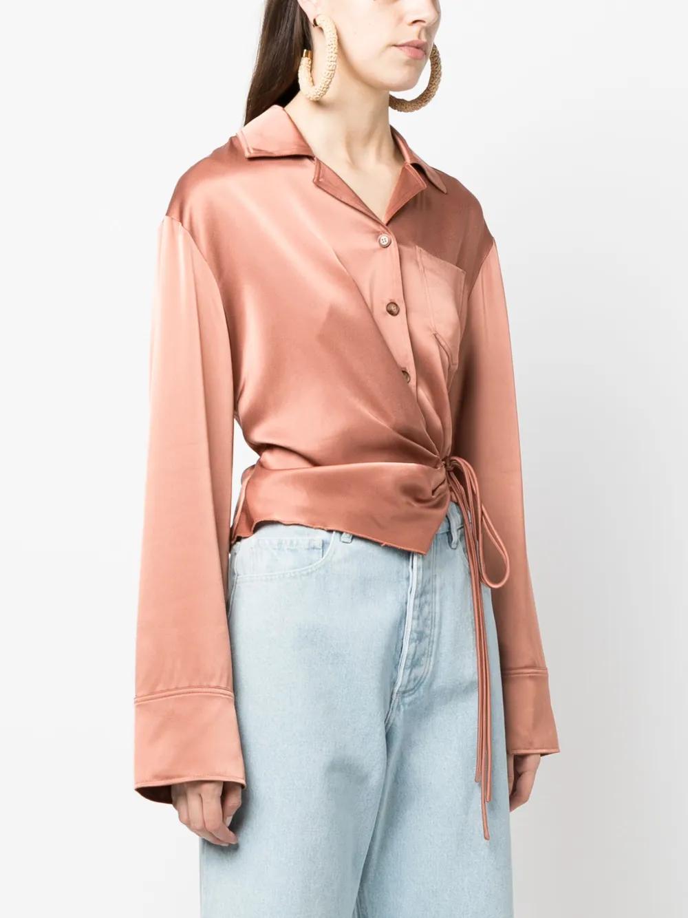 terracotta orange recycled polyester blend satin finish notched collar front button fastening side tie fastening long sleeves chest patch pocket