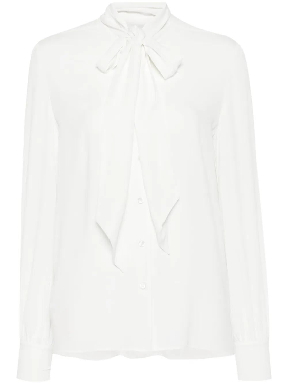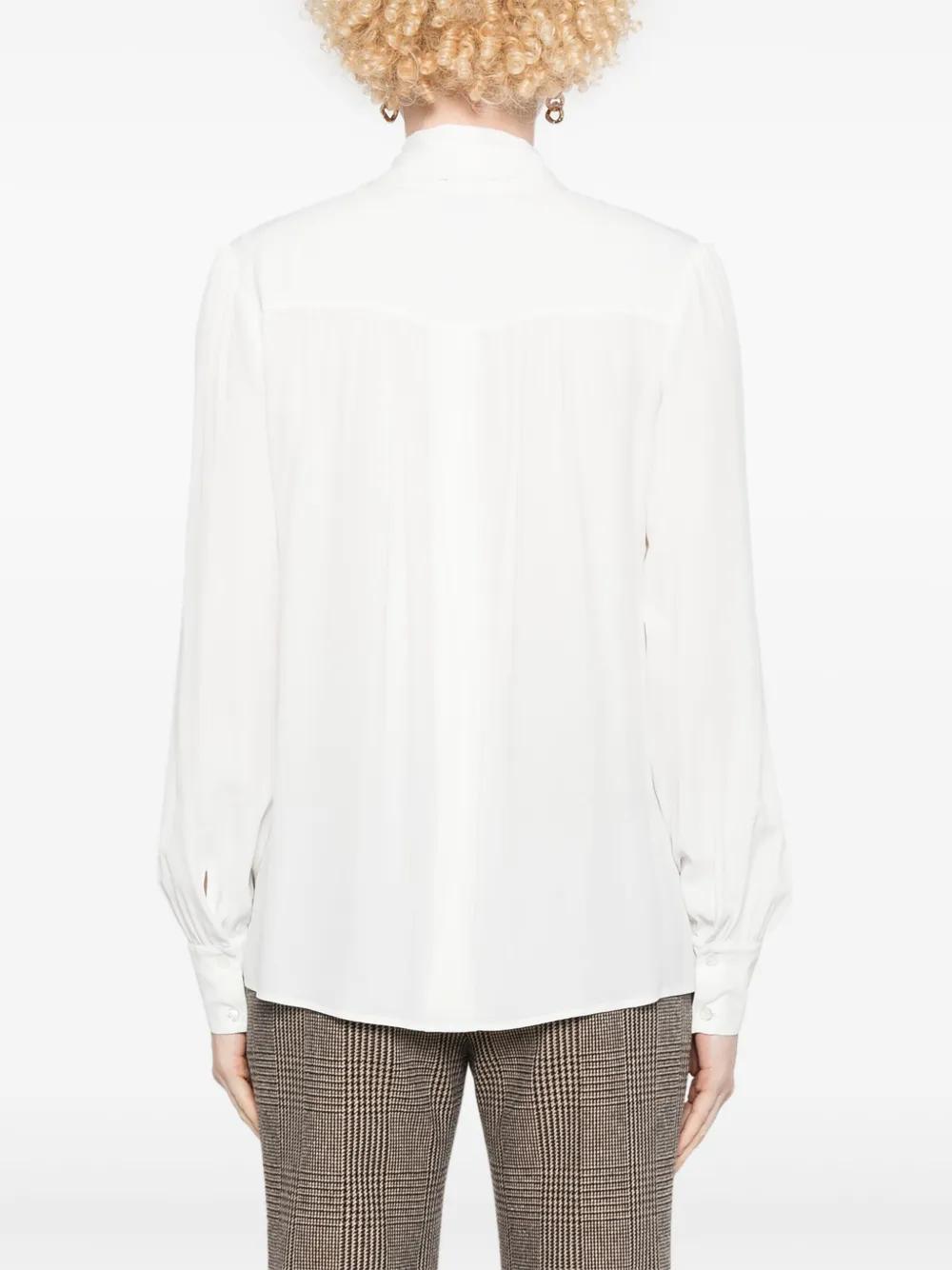 white chiffon crepe pussy-bow collar long sleeves buttoned cuffs curved hem front button placket