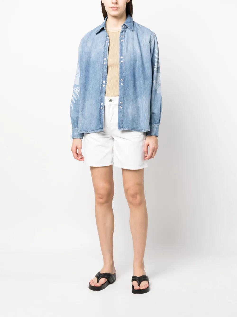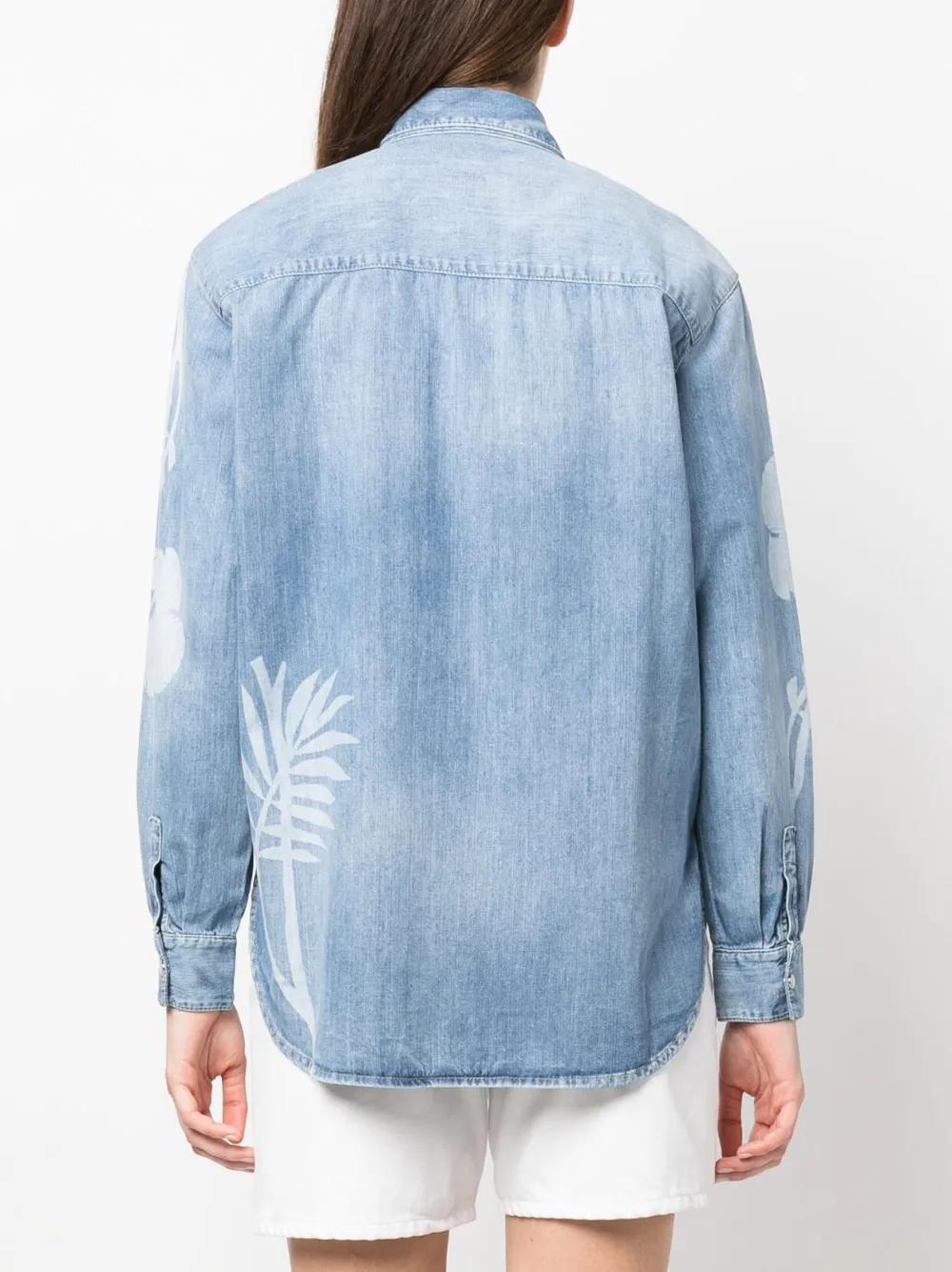 medium blue cotton denim floral print at the sleeve and to the rear classic collar front button fastening long sleeves buttoned cuffs curved hem