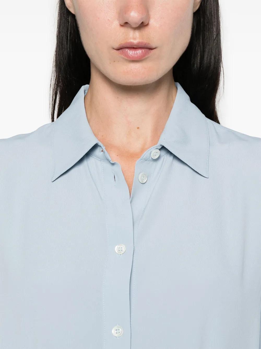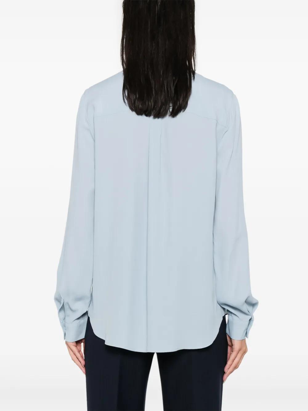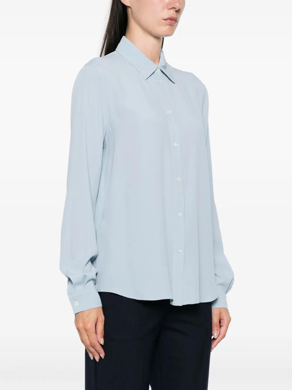light blue crepe de chine front button fastening classic collar long sleeves buttoned cuffs box-pleat detail curved hem