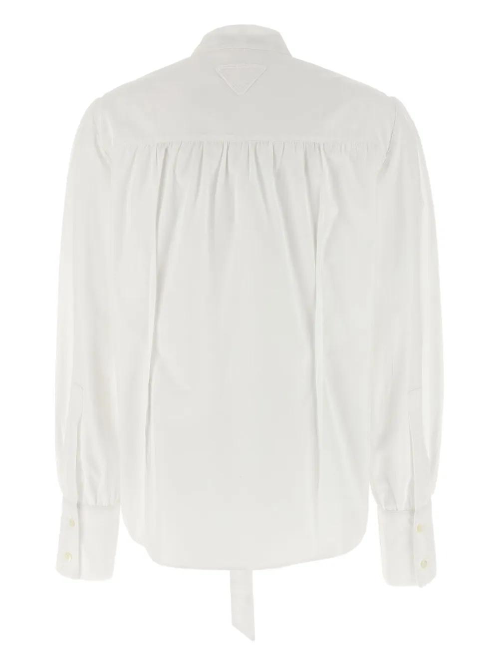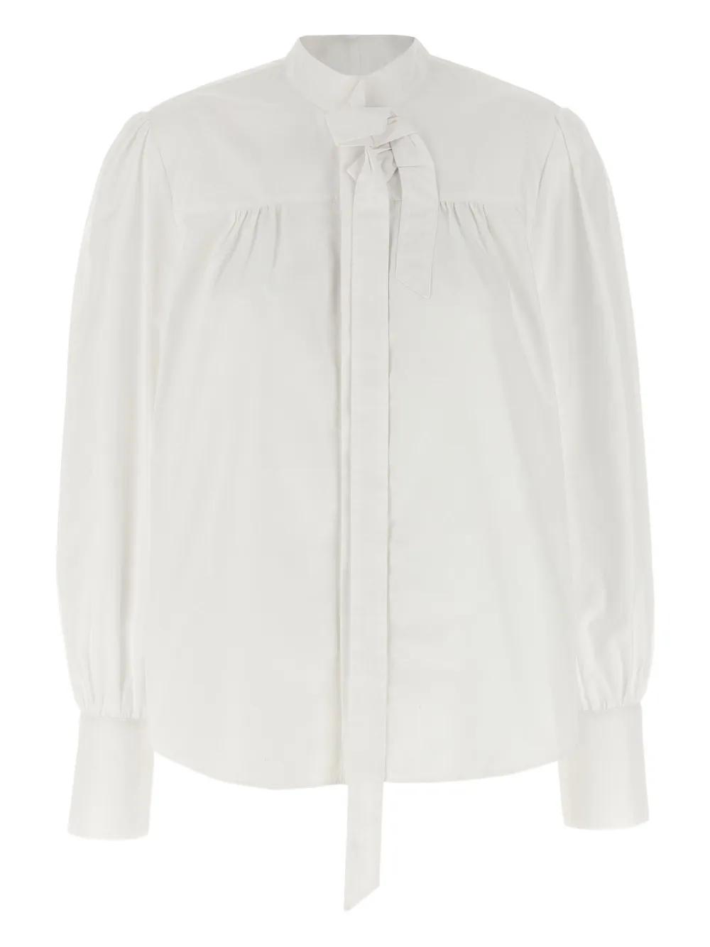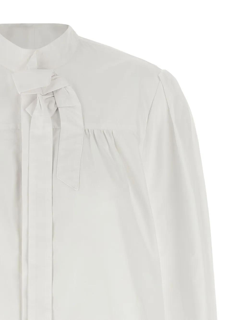 white korean collar bow detail front button closure long sleeves rear logo appliqué