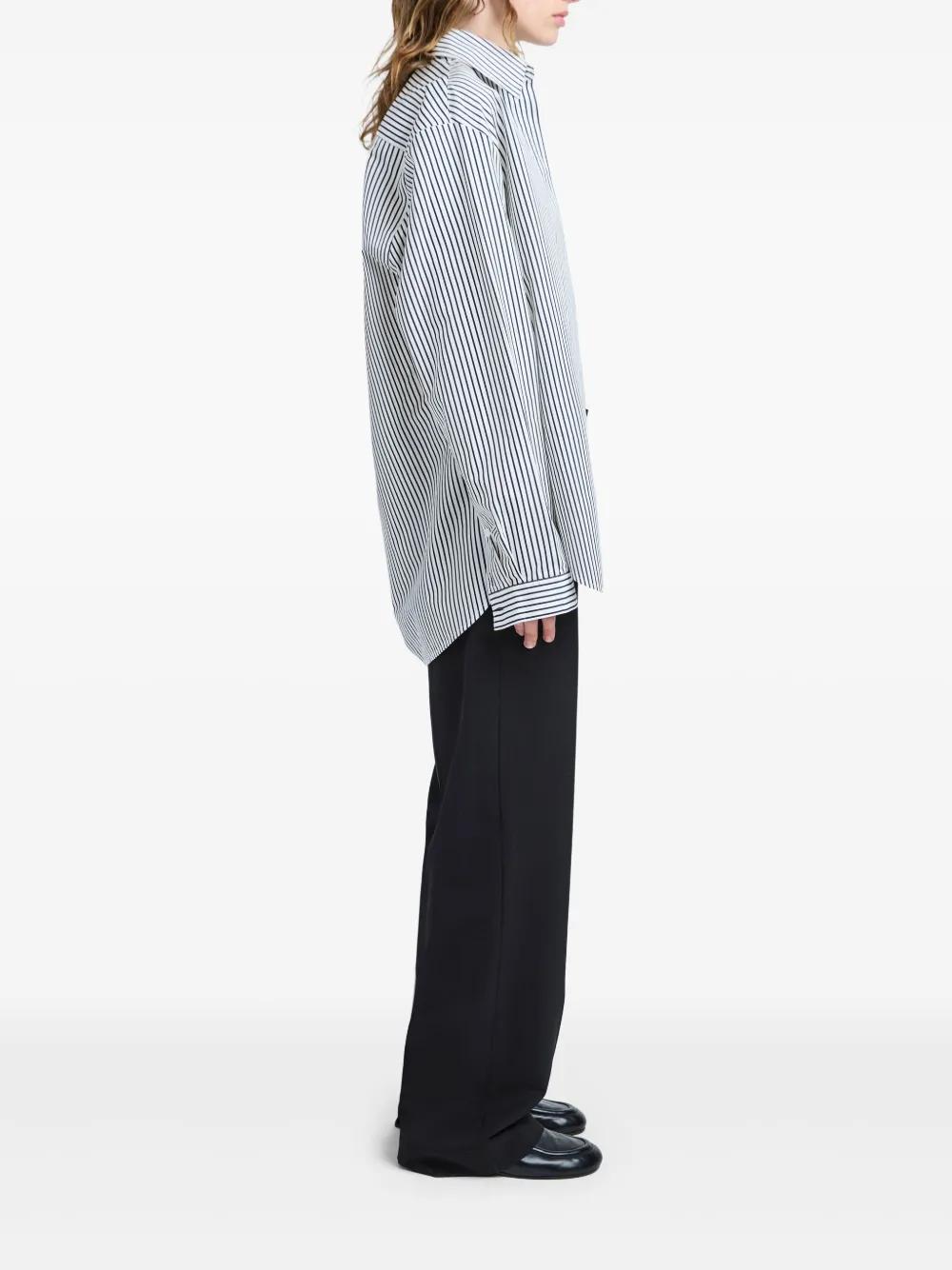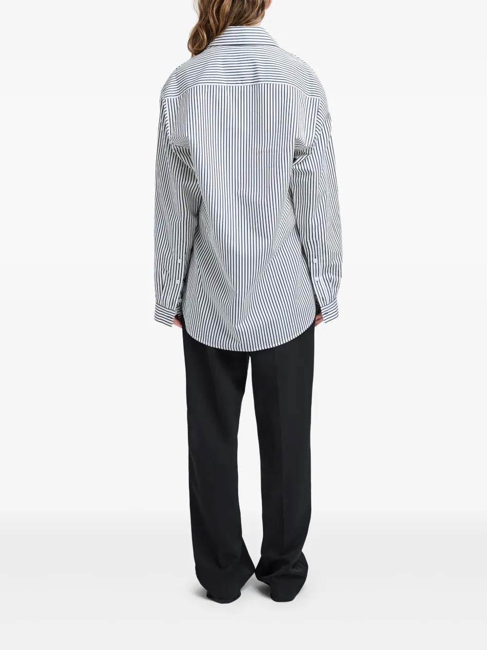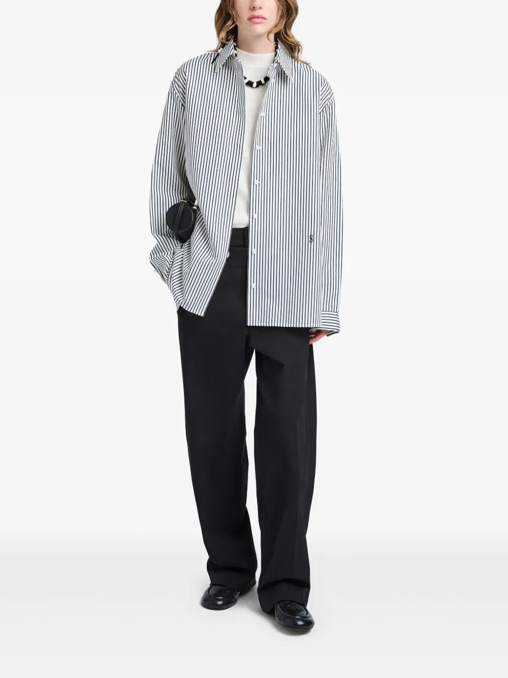 navy blue front button fastening buttoned cuffs vertical stripe pattern embroidered logo to the front