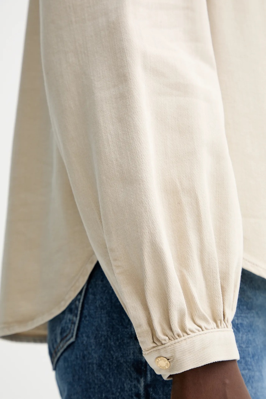 - Lyocell to tkanina podobna do jedwabiu, wytwarzana z celulozy drzewnej. Materiał ten powstaje w zrównoważonym procesie produkcji, bez wykorzystania toksycznych substancji. - Prosty, nie blokujący ruchów fason. - Długie, bufiaste rękawy. - Mankiety zapinane na guziki. - Wygodne zapięcie na guziki ułatwia zakładanie i zdejmowanie. - Model ze stójką. - Długość rękawa: 63 cm. - Długość z przodu: 61 cm. - Długość z tyłu: 64 cm. - Szerokość pod pachami: 48 cm. - Wymiary podane dla rozmiaru: S.