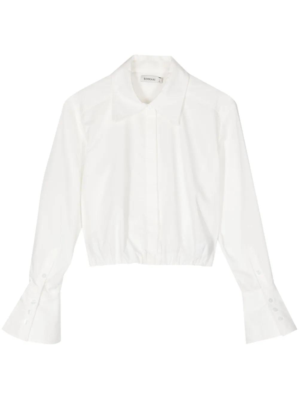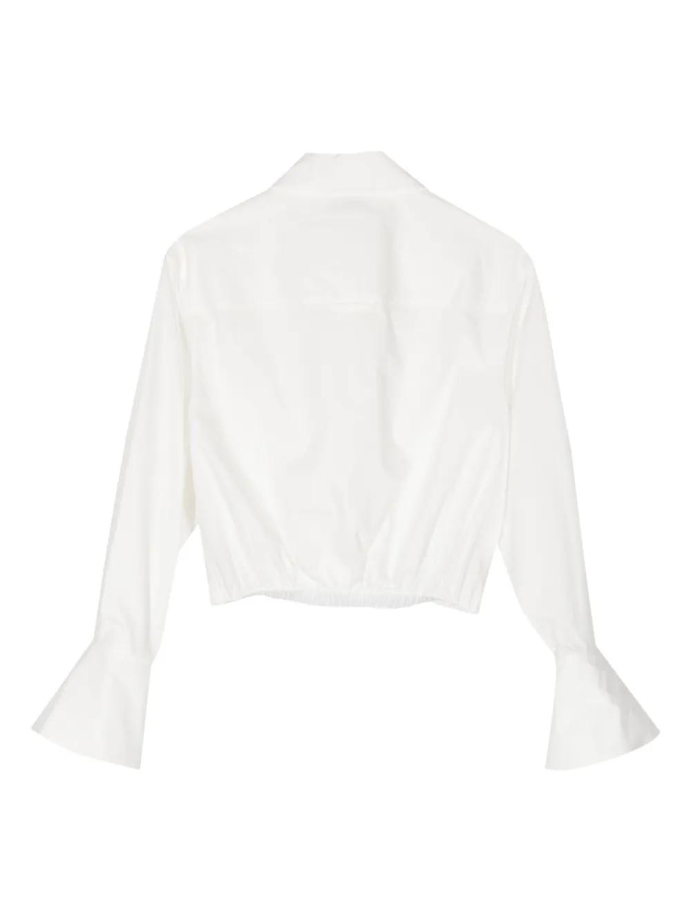 white cotton blend poplin texture straight-point collar front button fastening long sleeves buttoned cuffs flared cuffs elasticated hem cropped