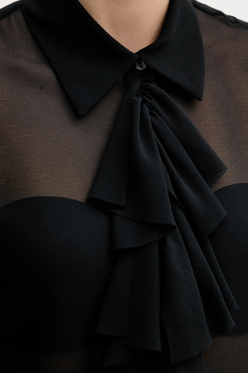 - Ten produkt został częściowo uszyty z poliestru pochodzącego z recyklingu. - Prosty, nie blokujący ruchów fason. - Model z kołnierzykiem. - Mankiety zapinane na guziki. - Model z ozdobną falbaną. - Kryte zapięcie na guziki. - Cienka, nieelastyczna tkanina. - Długość rękawa: 62 cm. - Długość: 63 cm. - Szerokość pod pachami: 50 cm. - Wymiary podane dla rozmiaru: S.