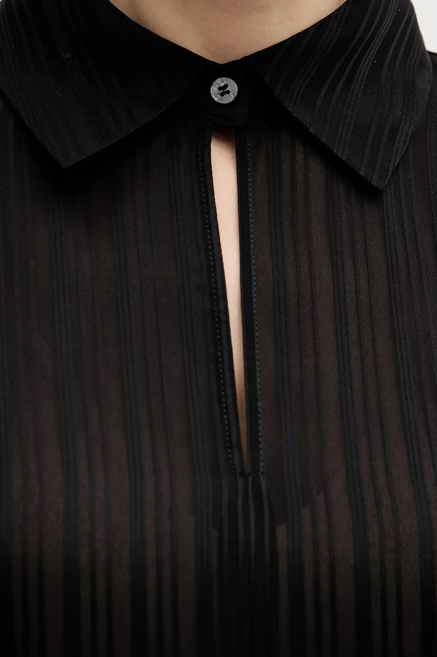 - Luźny krój z opuszczoną linią ramion. - Model z miękkim kołnierzykiem. - Zapięcie na guzik. - Mankiety zapinane na guziki. - Długość rękawa(mierzona od kołnierzyka): 72 cm. - Długość: 65 cm. - Szerokość pod pachami: 59 cm. - Wymiary podane dla rozmiaru: S.