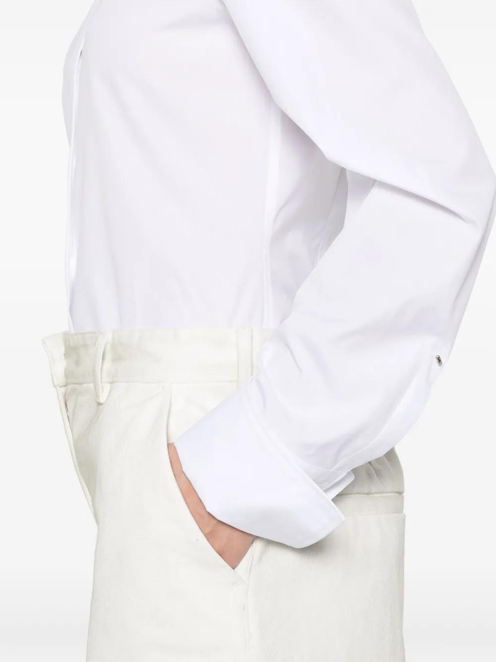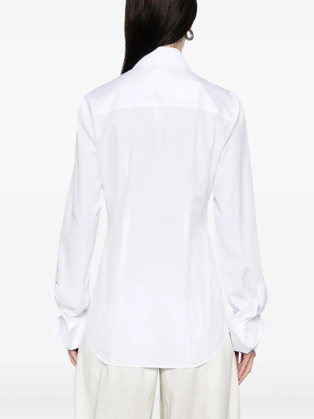 white concealed front fastening buttoned cuffs pointed flat collar curved hem