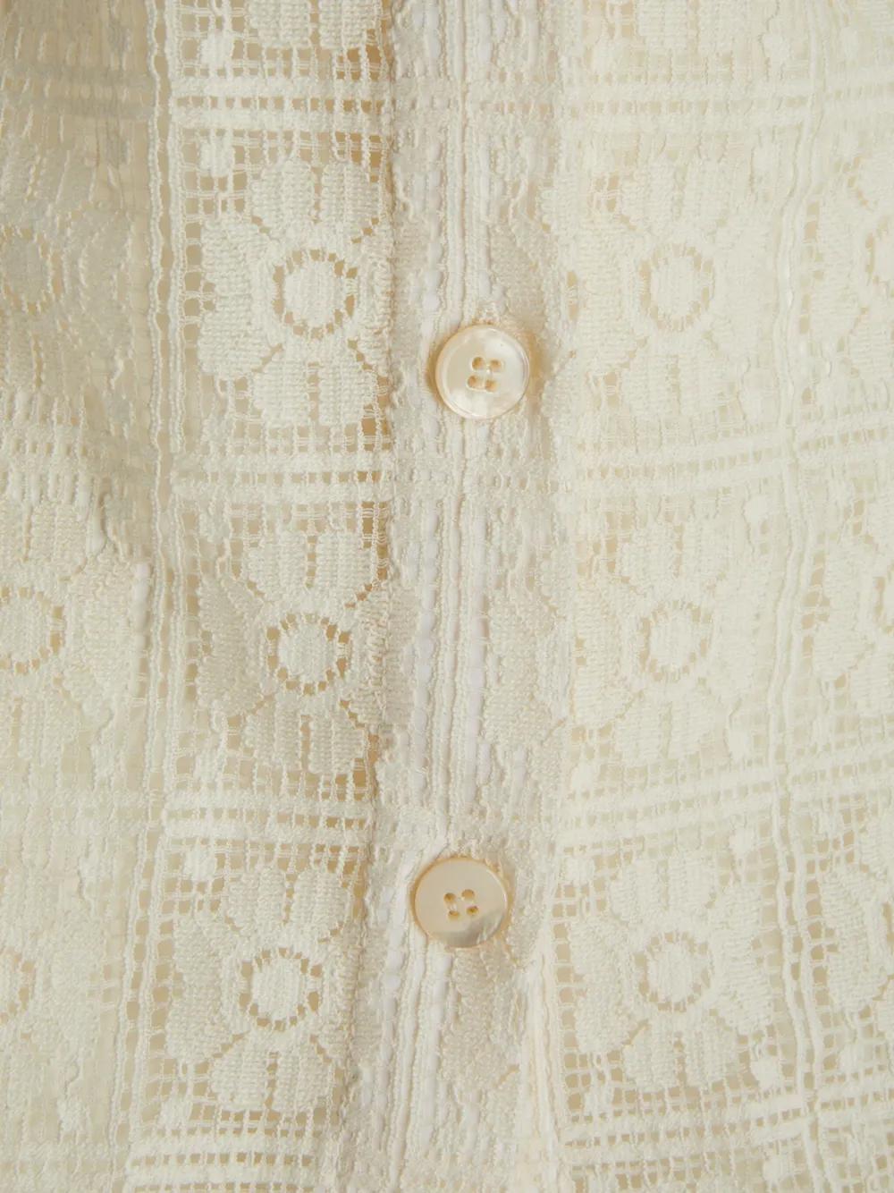 cream white cotton blend floral lace semi-sheer construction front button placket pointed flat collar extra-long sleeves buttoned cuffs straight hem