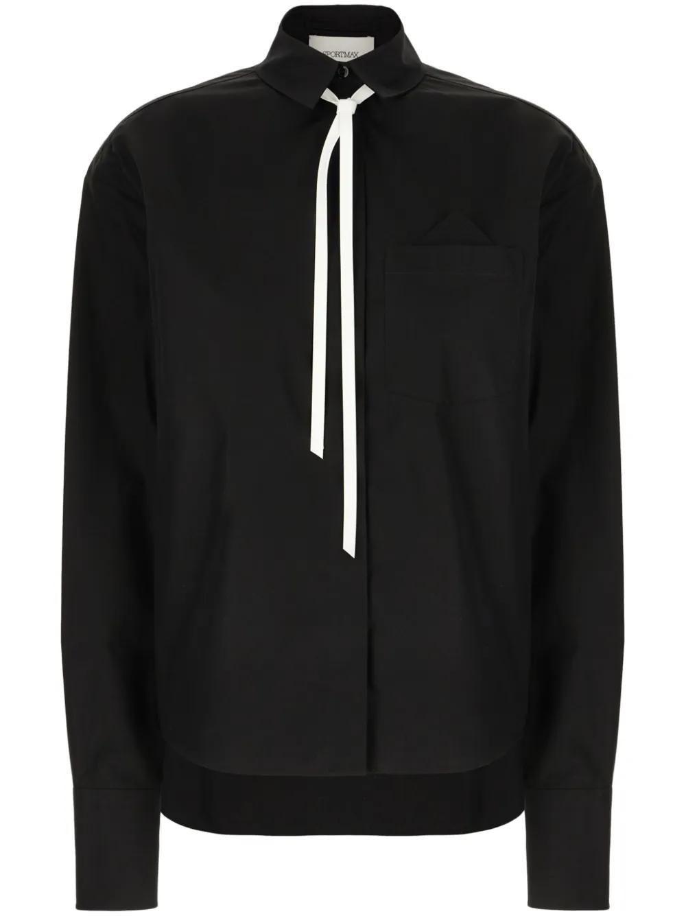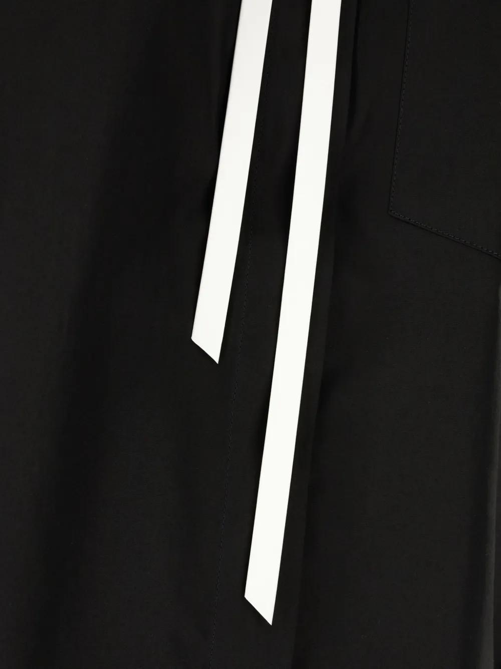black cotton poplin texture concealed front fastening classic collar tie strap long sleeves buttoned cuffs curved hem