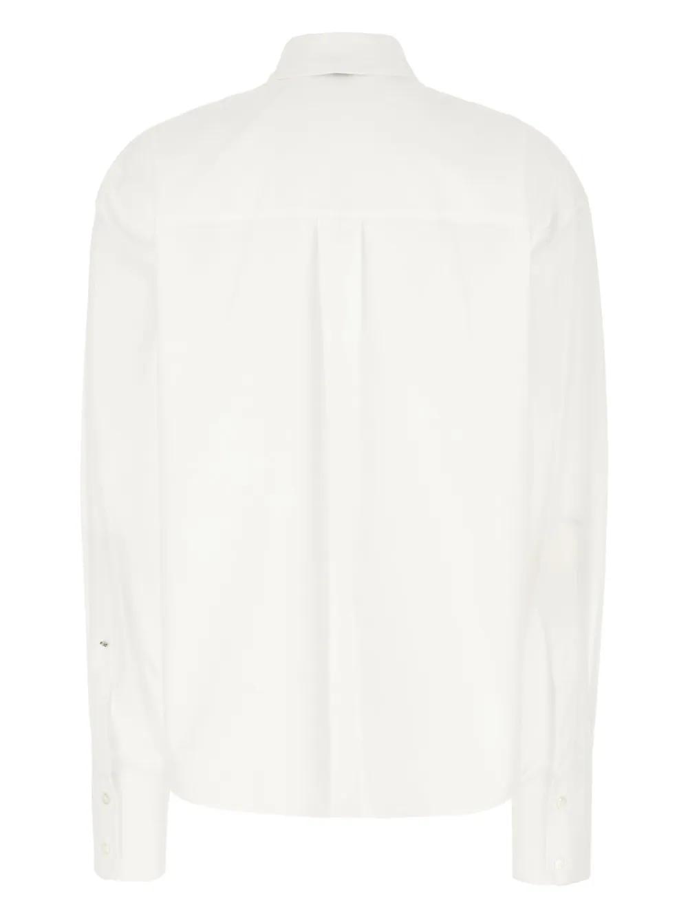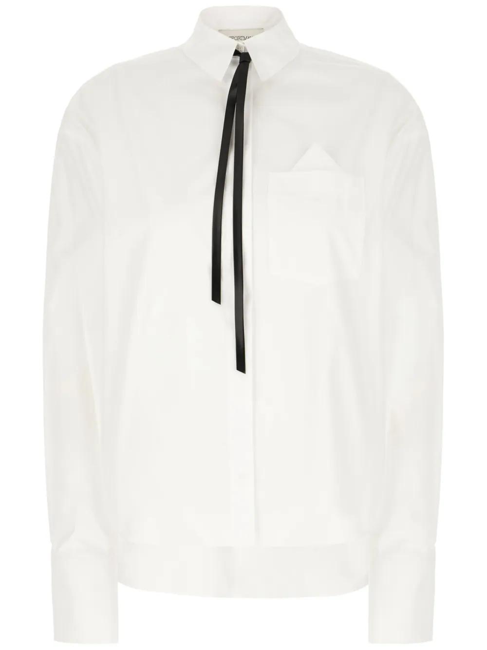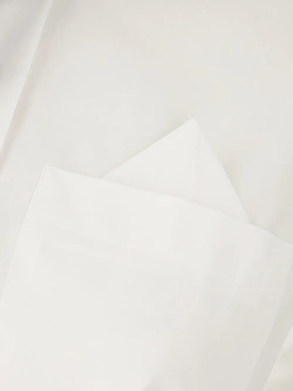 white cotton poplin texture pointed flat collar removable thin necktie drop shoulder long sleeves buttoned cuffs chest patch pocket scarf detailing box-pleat detail high-low hem