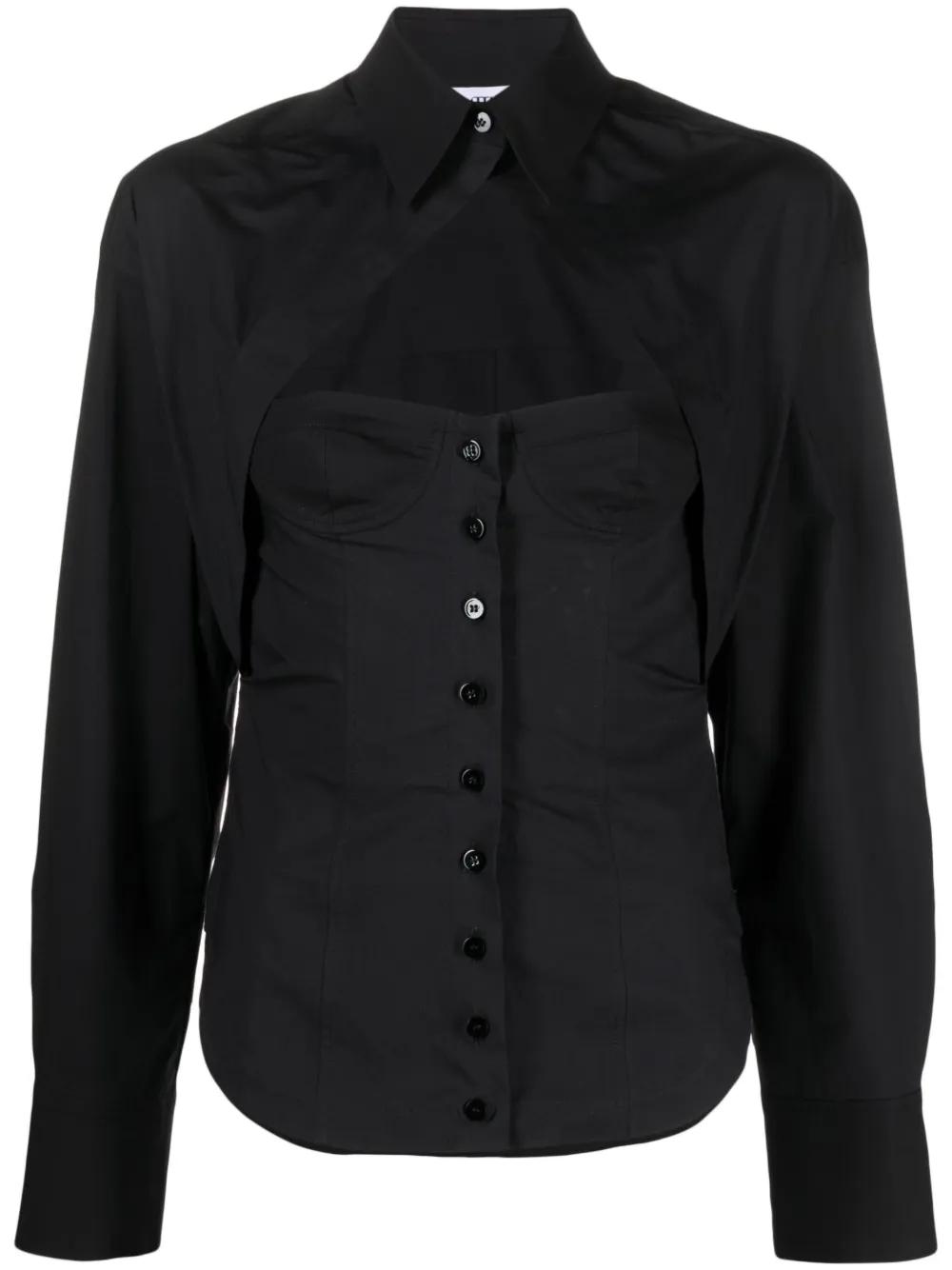 black stretch-cotton corset style cut-out detailing front button fastening classic collar long sleeves curved hem