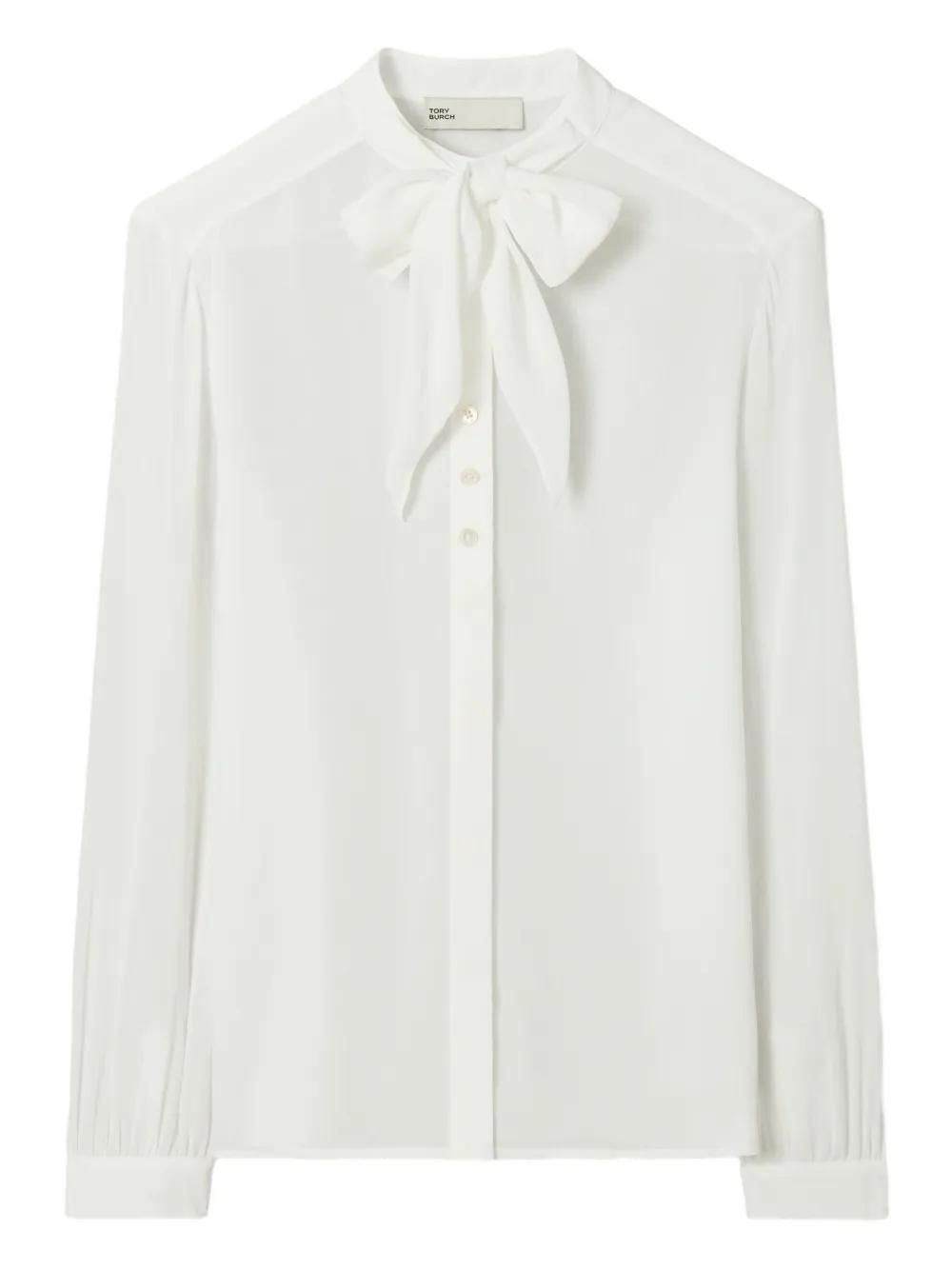 off-white georgette fabric bow-tie neck long sleeves button front-fastening