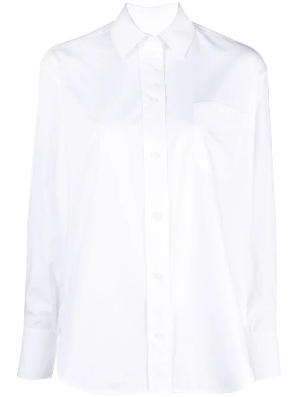 white organic cotton poplin texture embroidered logo to the front classic collar front button fastening long sleeves buttoned cuffs chest patch pocket rear curved hem