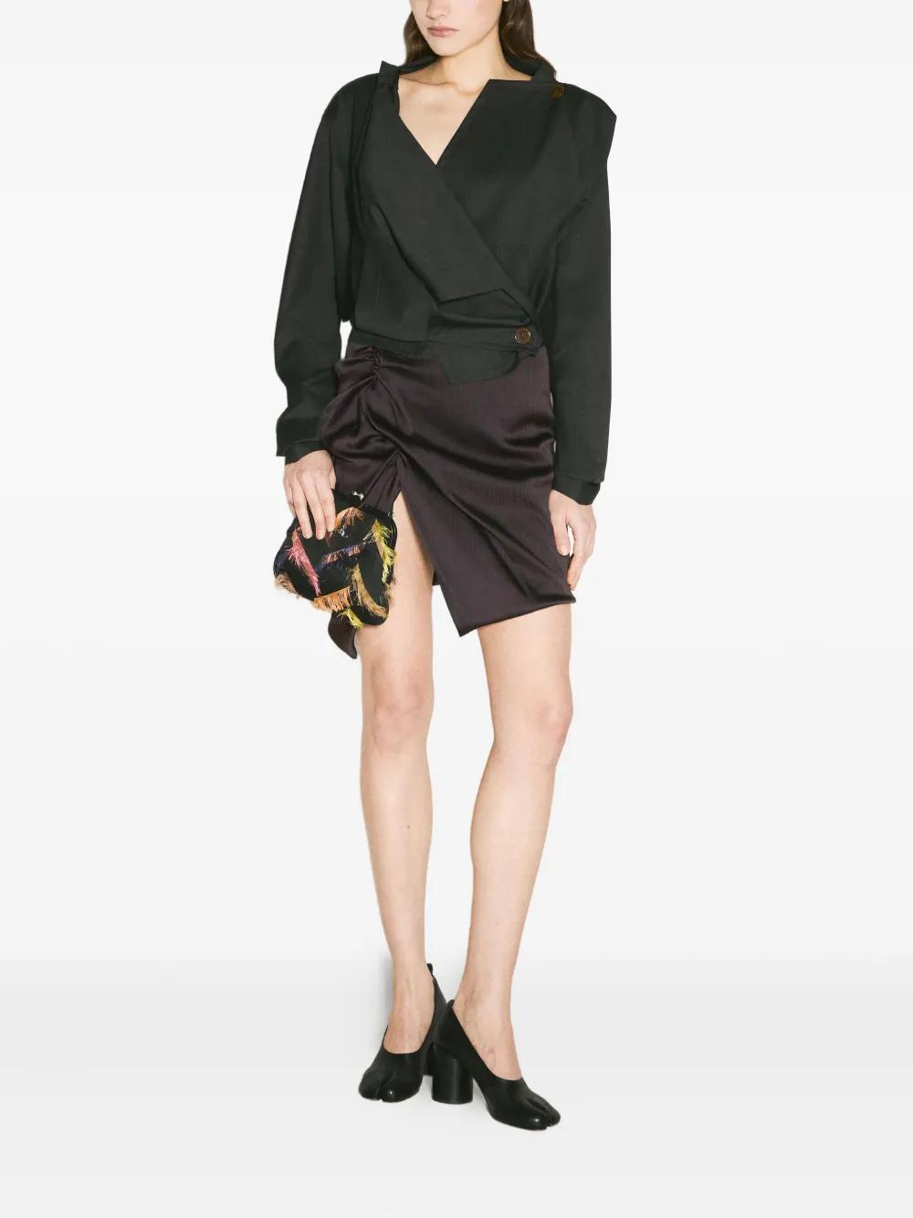 black draped neckline button fastening long sleeves shoulder pads asymmetrical hemline