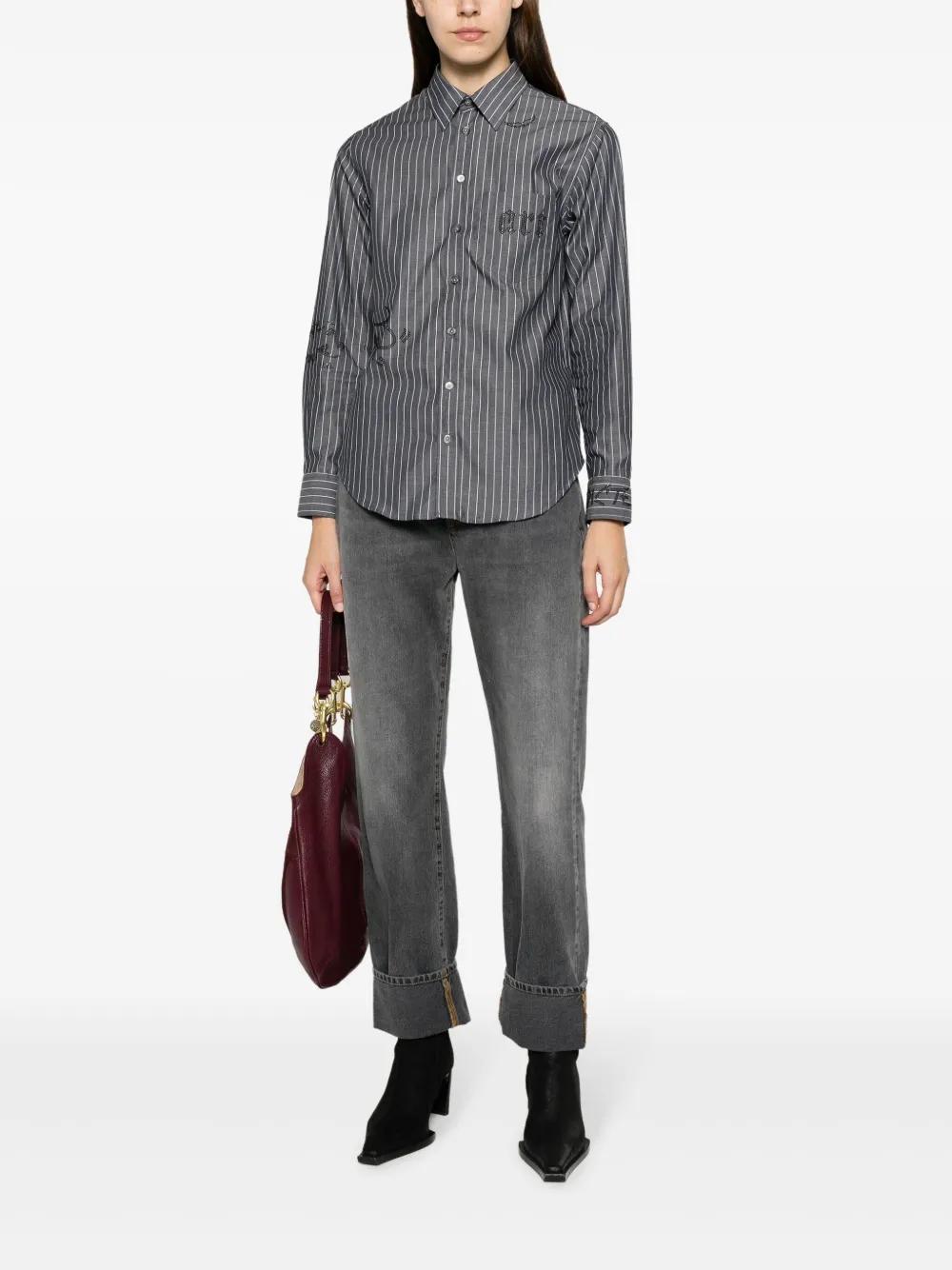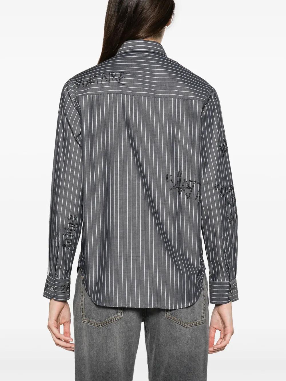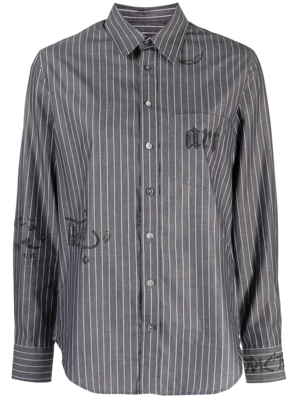 medium grey/optical white/jet black organic cotton vertical stripe pattern rhinestone embellishment pointed flat collar front button fastening long sleeves buttoned cuffs chest patch pocket short side slits straight hem