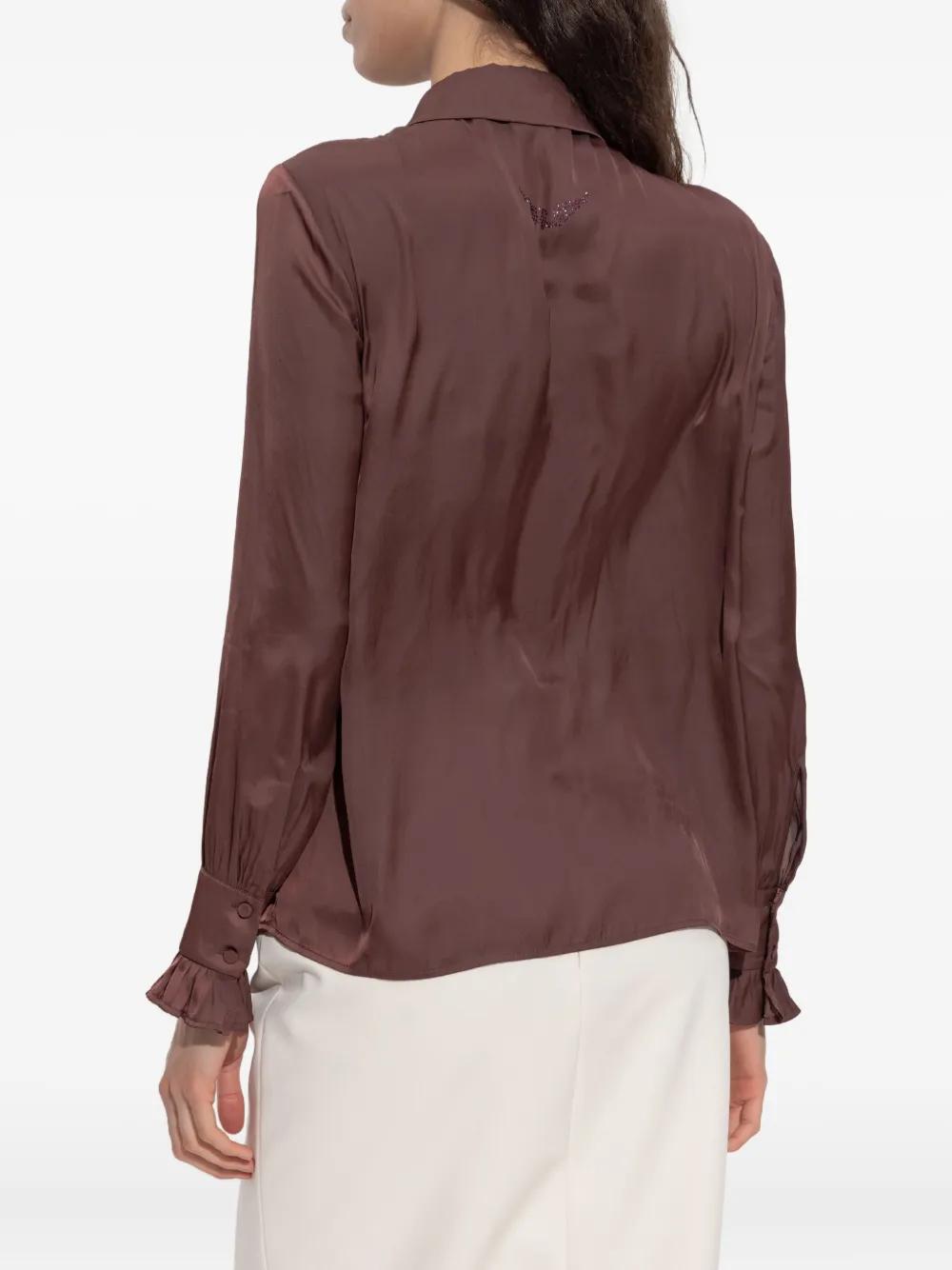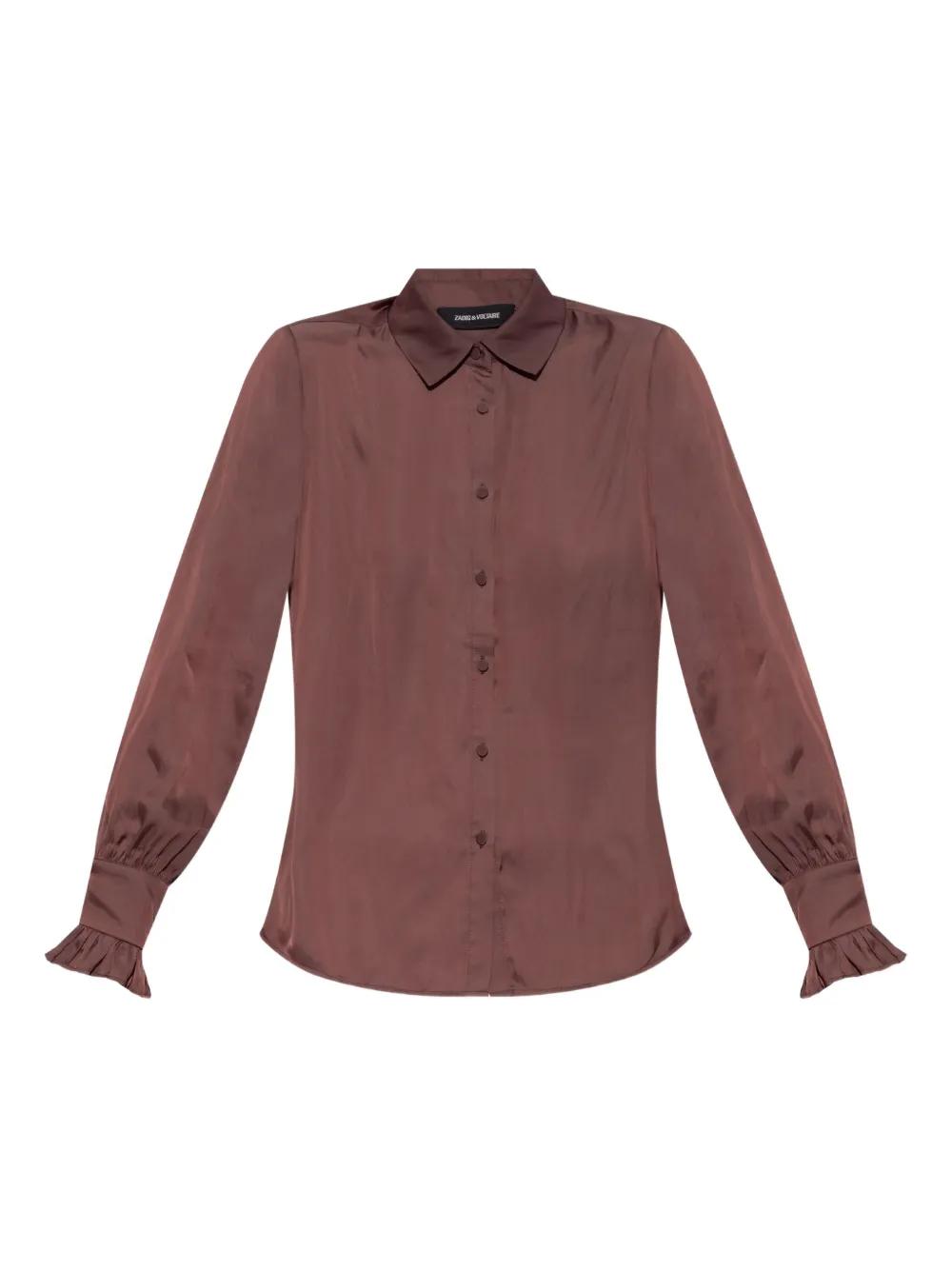 brown button fastening long sleeves ruffled cuffs classic collar satin finish
