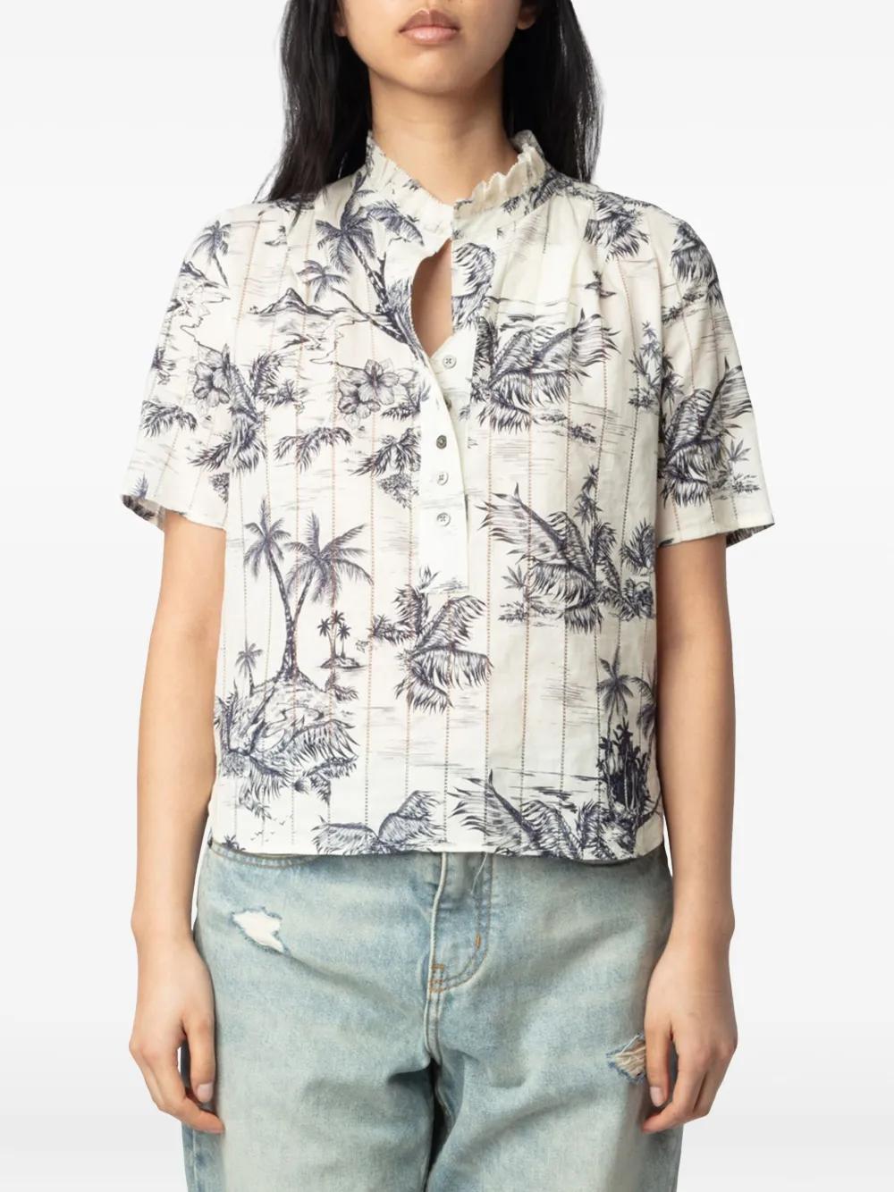 white front button fastening ruffle collar all-over graphic print rear curved hem