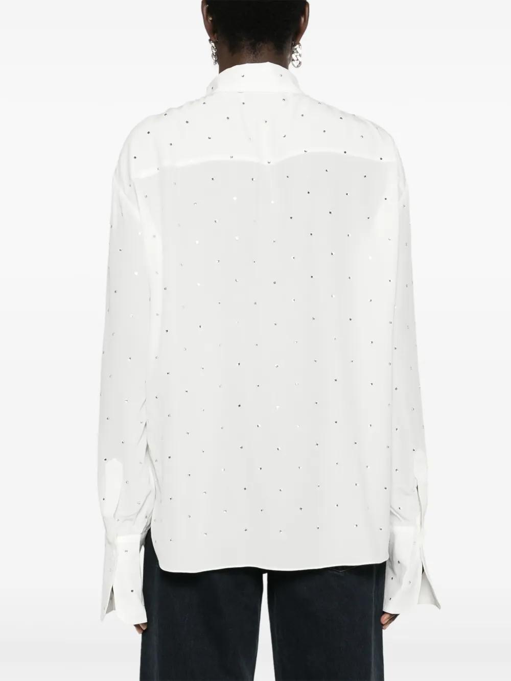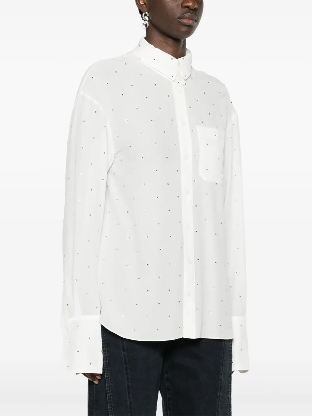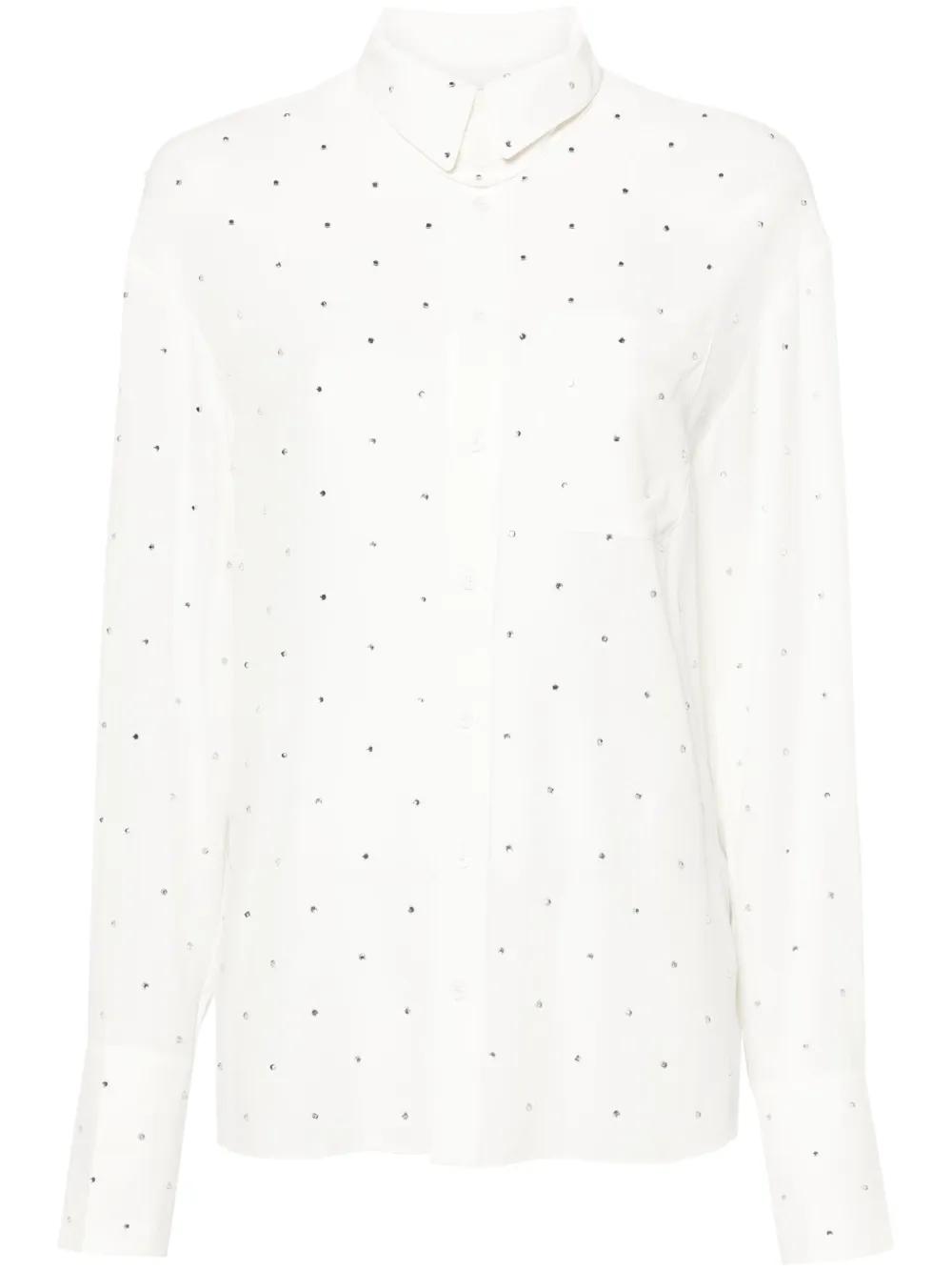 ivory white silk rhinestone embellishment embroidered logo to the side detachable panel classic collar front button fastening drop shoulder long sleeves with buttoned cuffs chest patch pocket curved hem