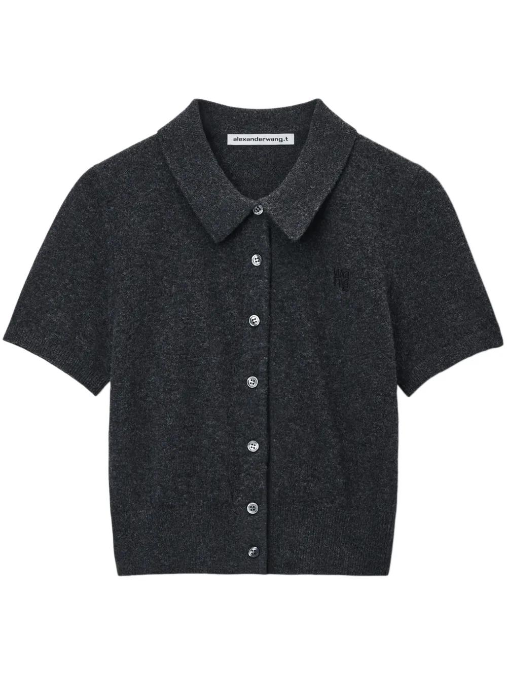 charcoal grey wool mélange effect front button fastening polo collar short sleeves embroidered logo at the chest straight hem cropped