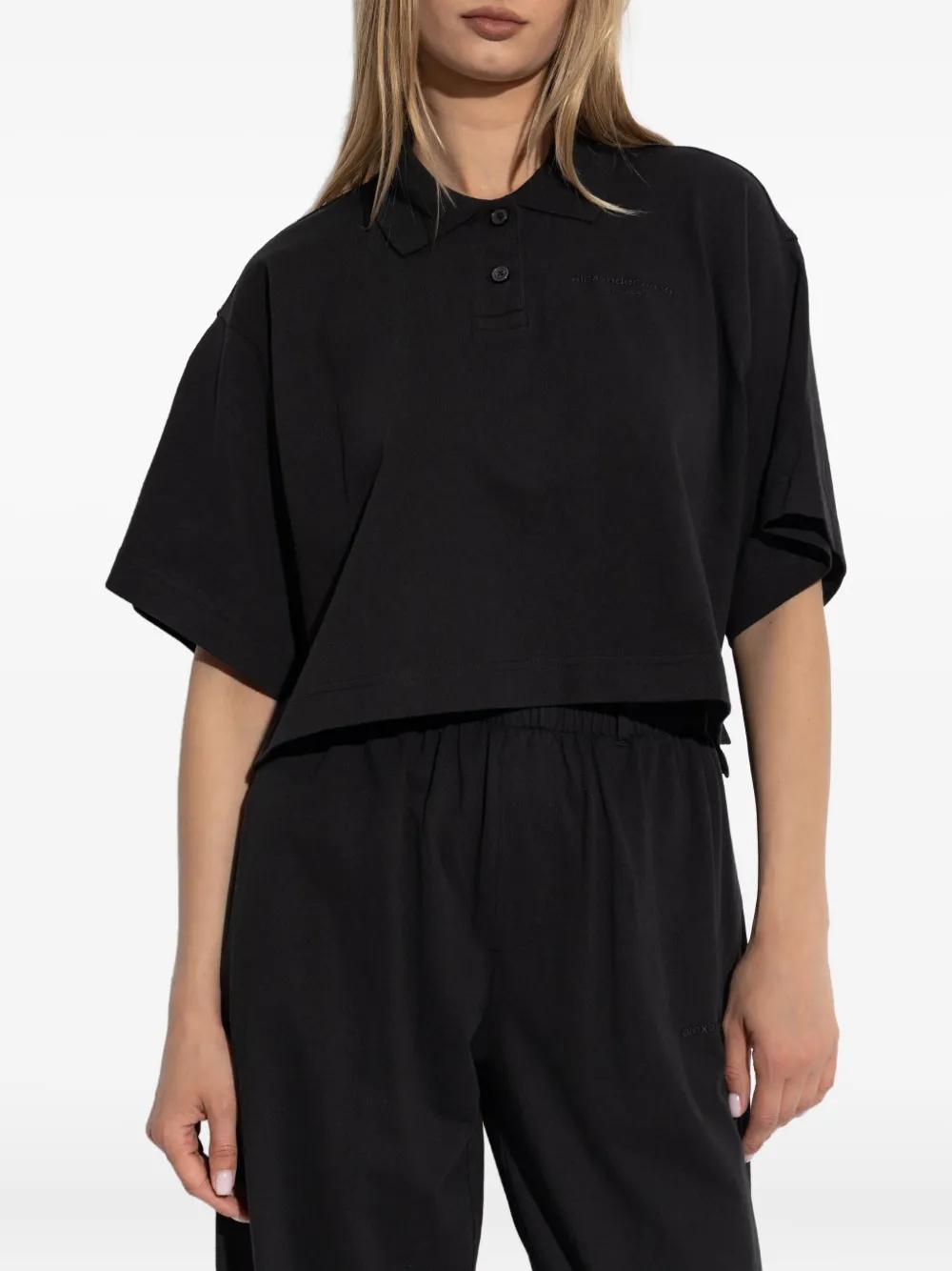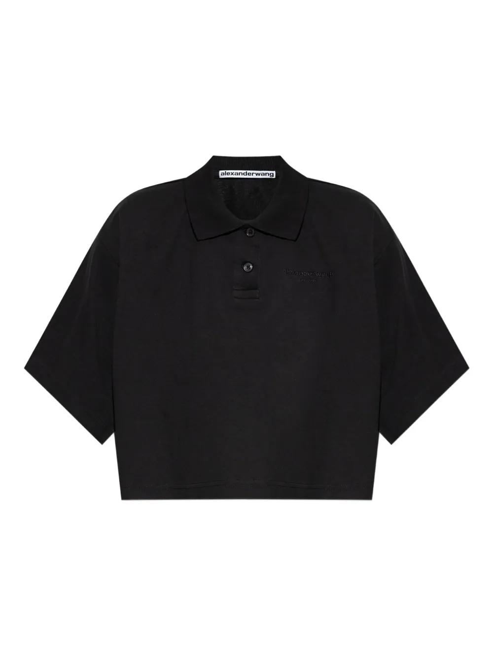 black polo collar short sleeves button fastening embroidered logo cropped hem