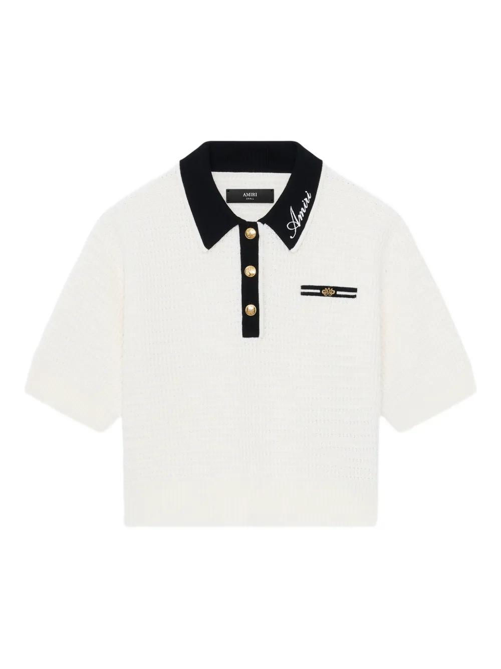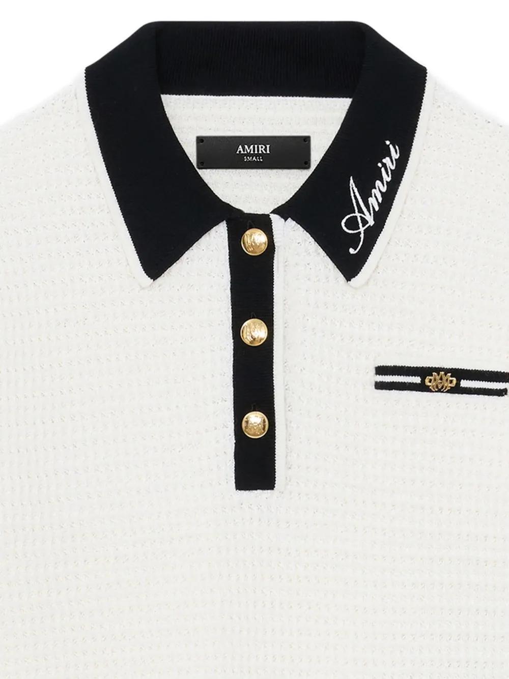 ivory waffle knit logo embroidery button fastening chest embellishment contrasting collar