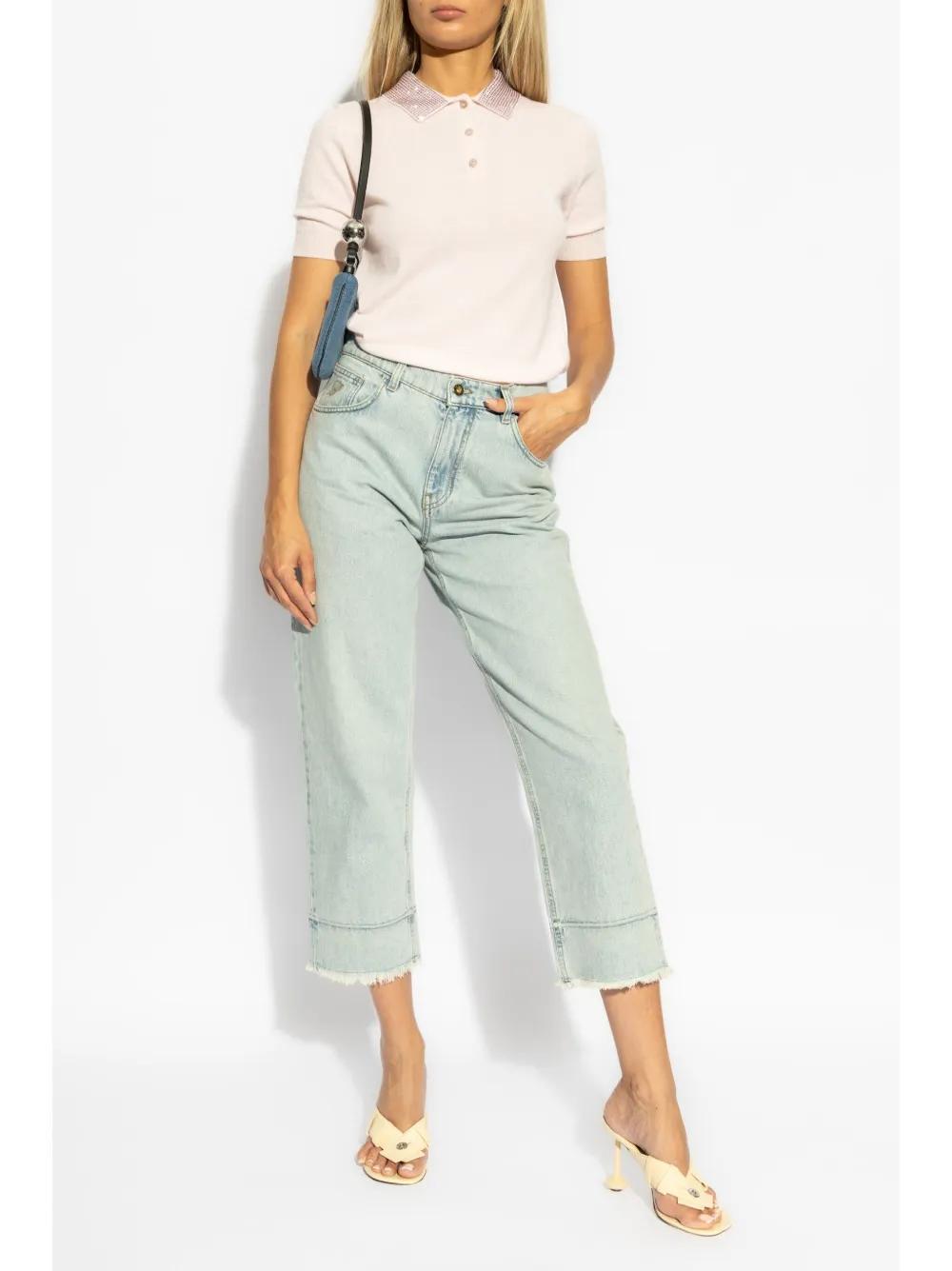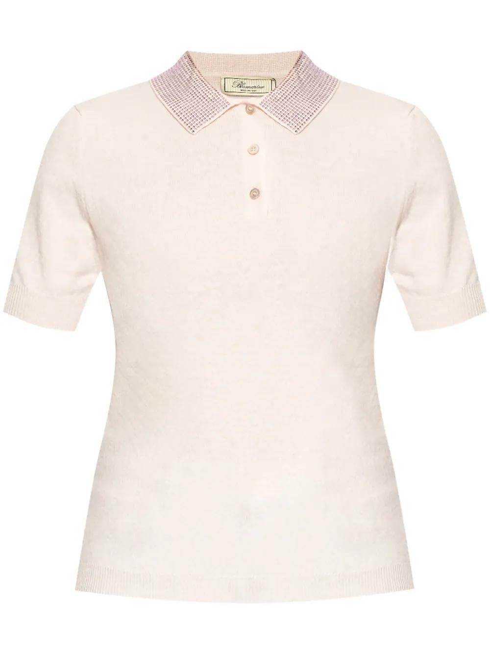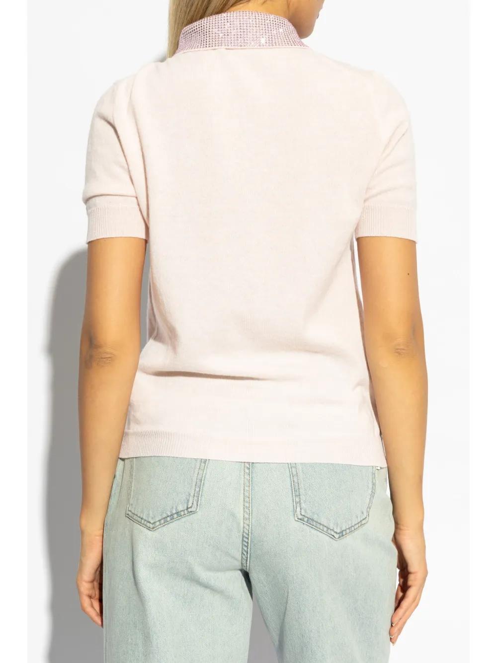 light pink wool-cashmere blend fine knit rhinestone embellishment polo collar front button placket short sleeves straight hem