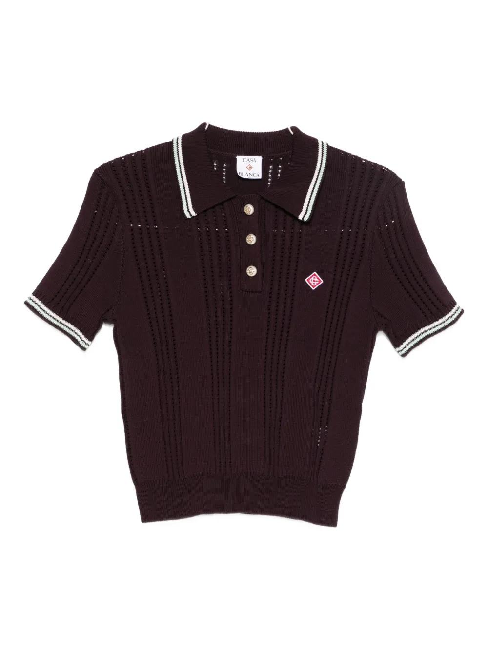 dark red striped trim front button placket polo collar short sleeves logo detail