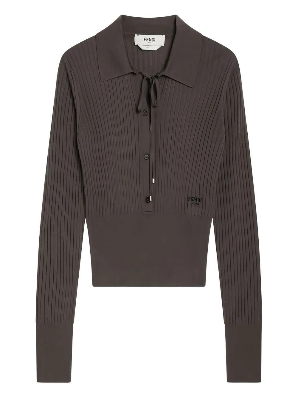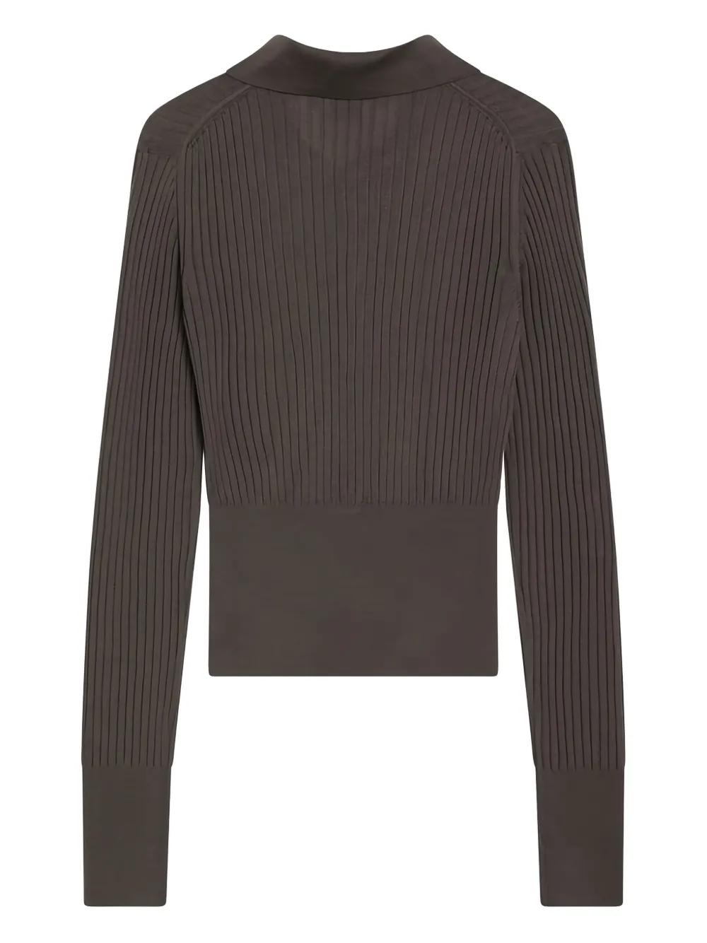 brown ribbed knit button fastening tie detail polo collar long sleeves