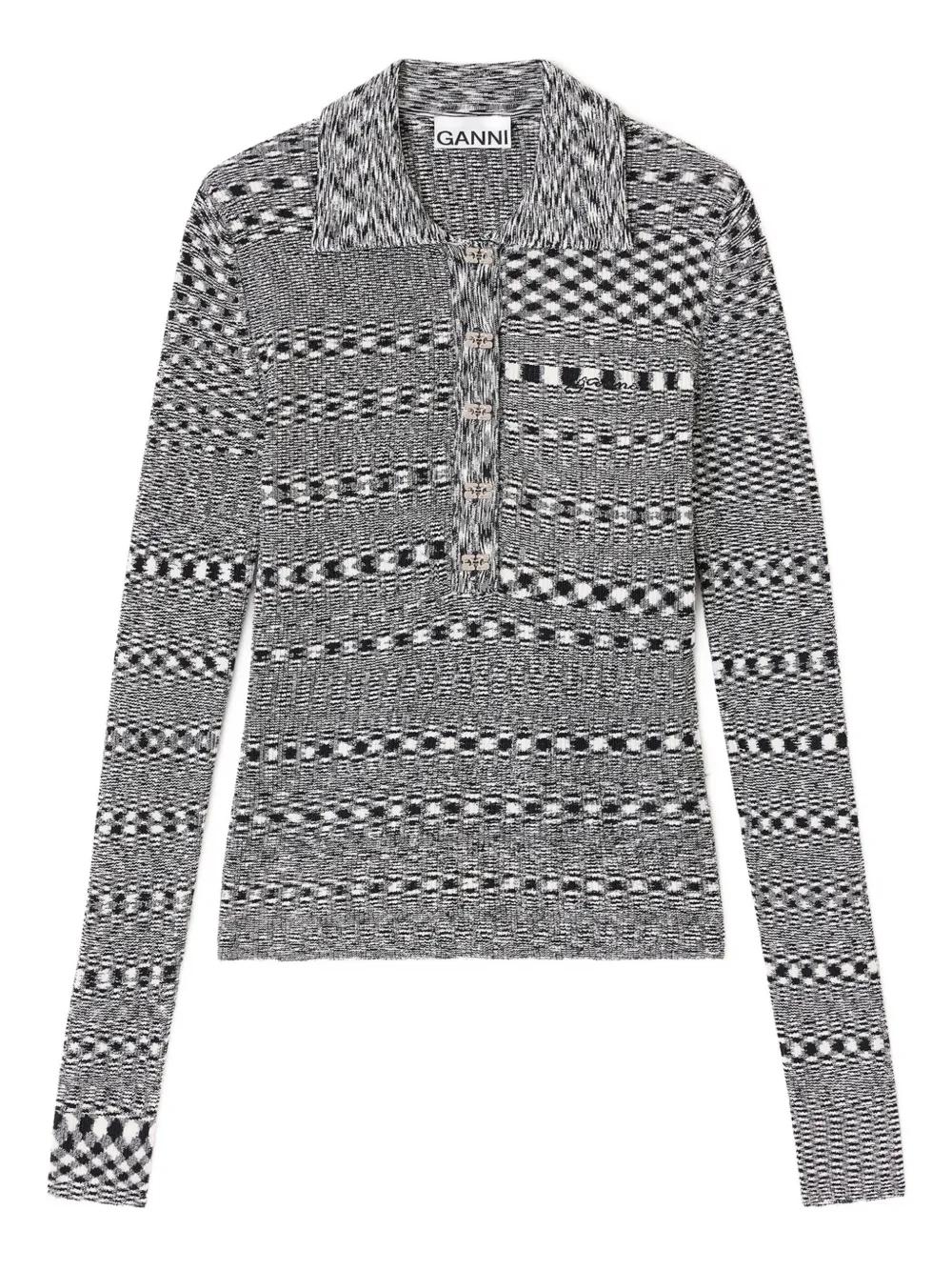 black and white space-dye effect check pattern polo neck long sleeves button fastening