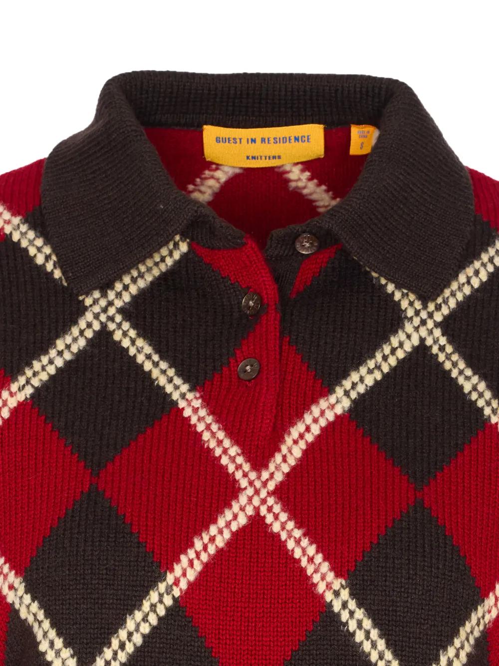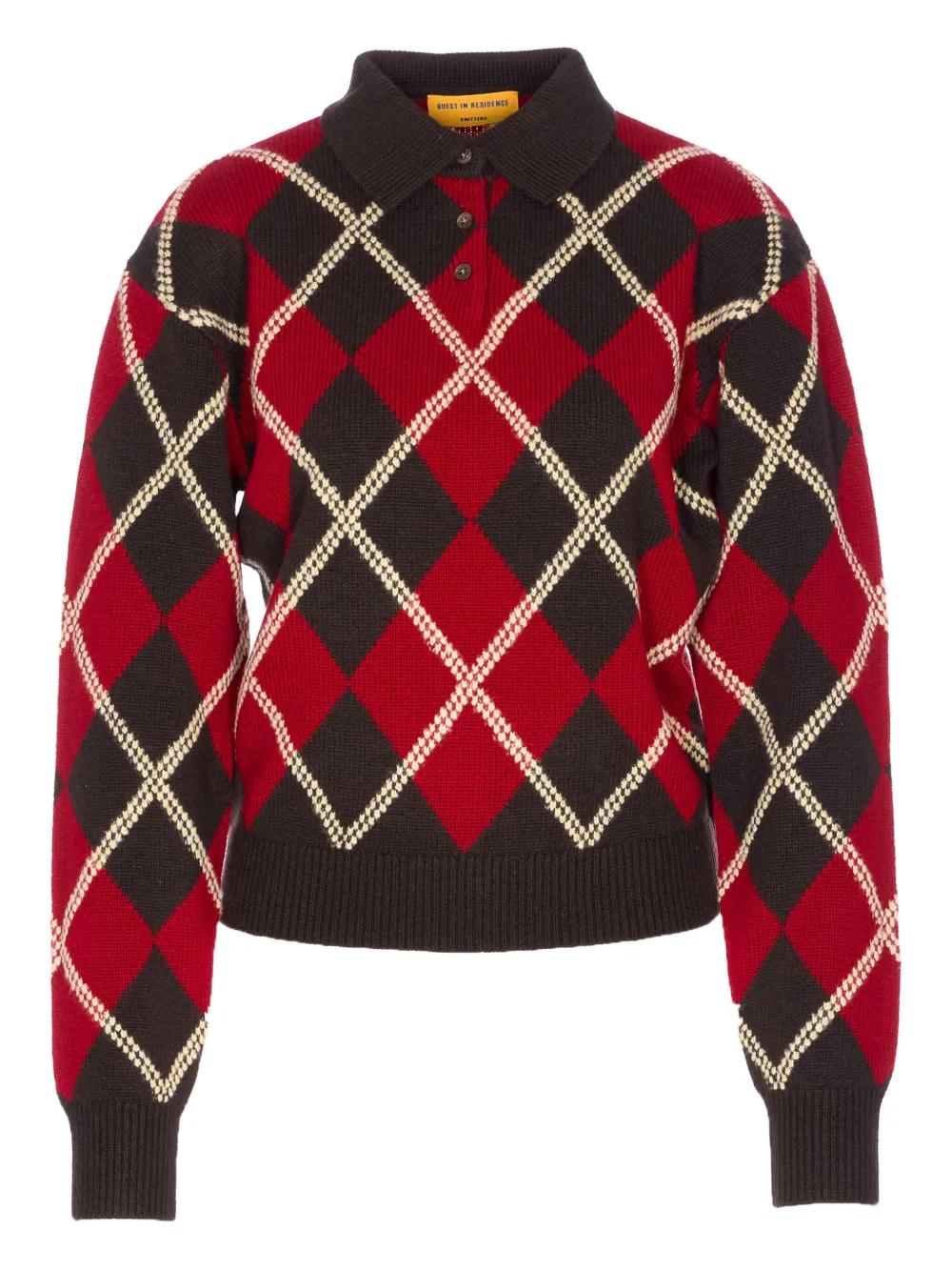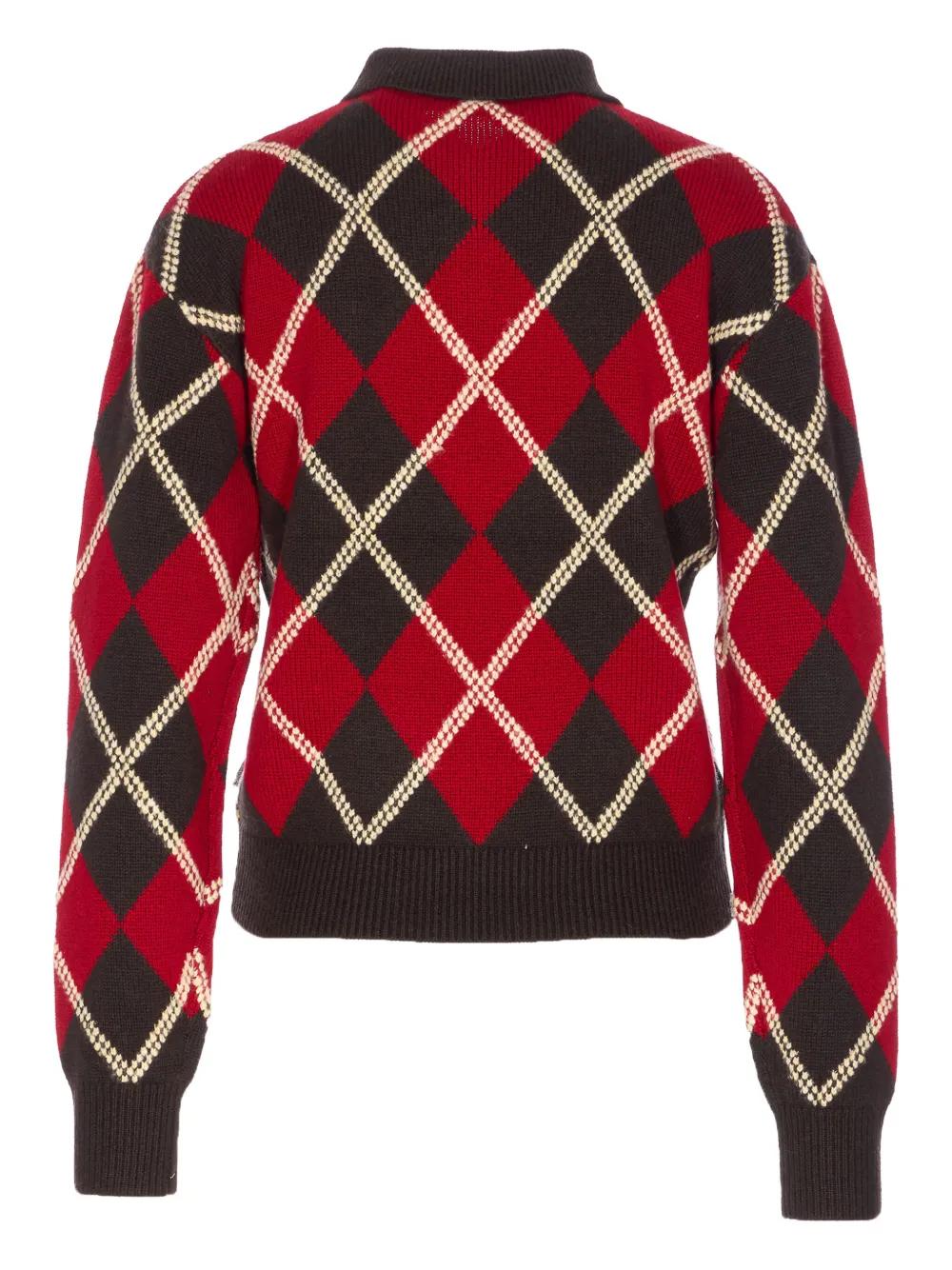 brown and red argyle pattern polo collar long sleeves ribbed trim knitted construction