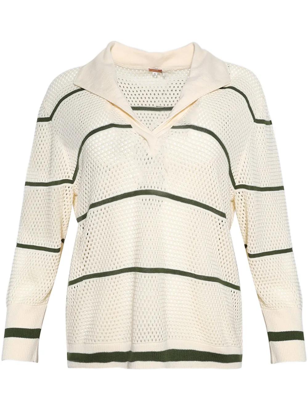 light beige V-neck spread collar ribbed cuffs and hem perforated design