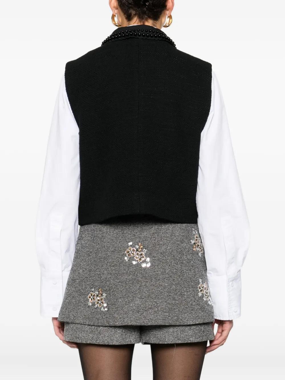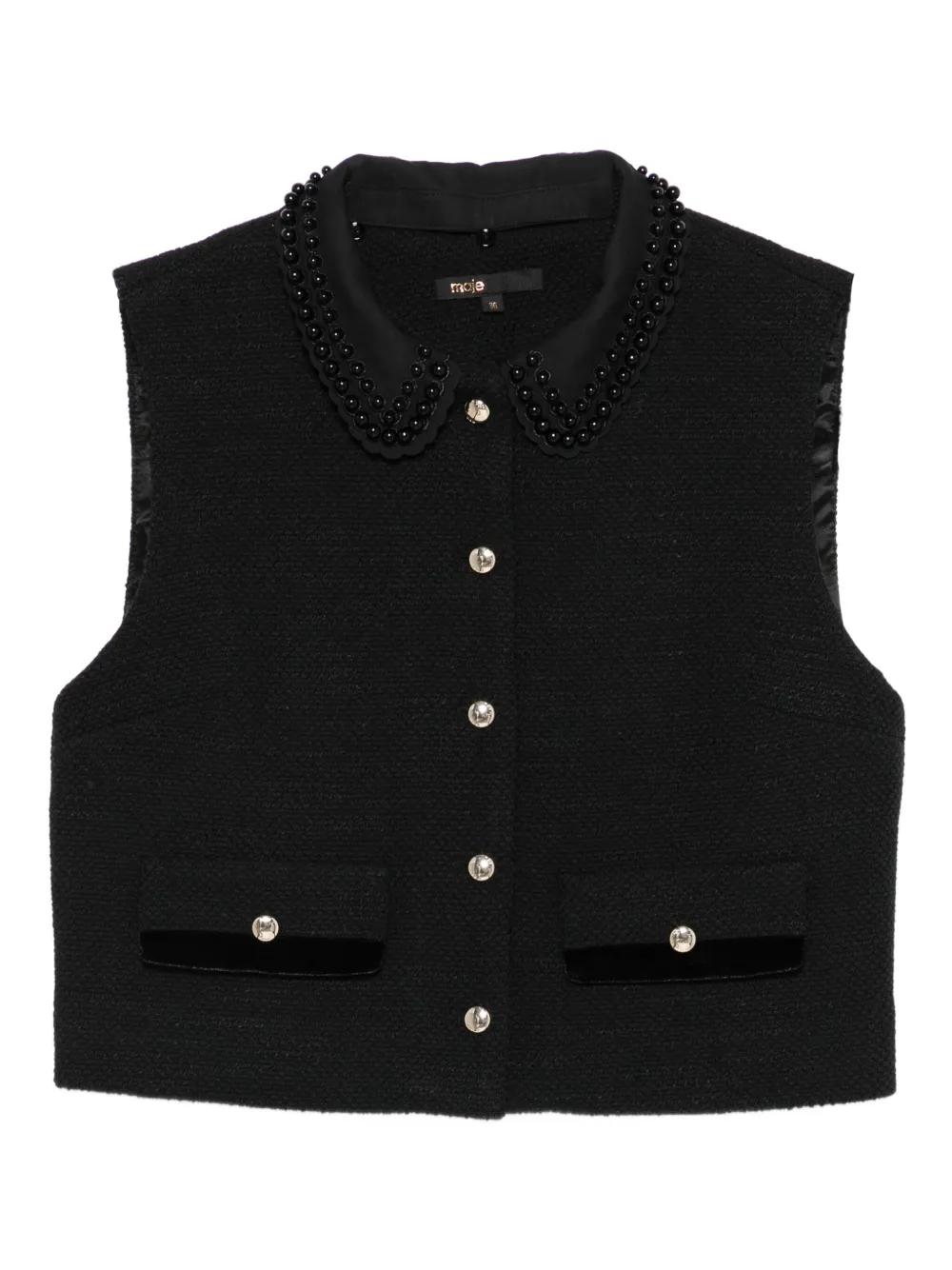 black beaded collar front button fastening two front flap pockets velvet trim sleeveless