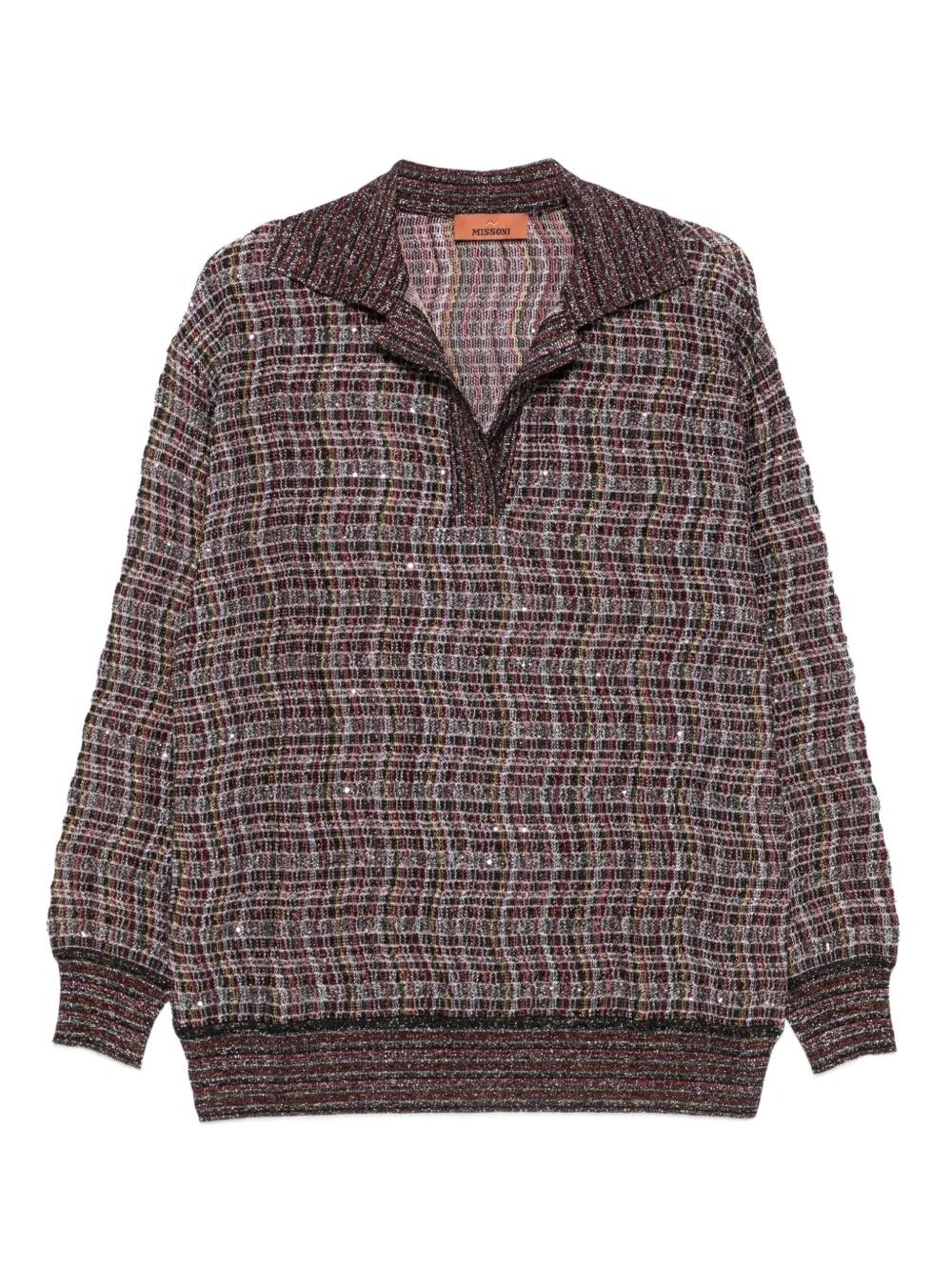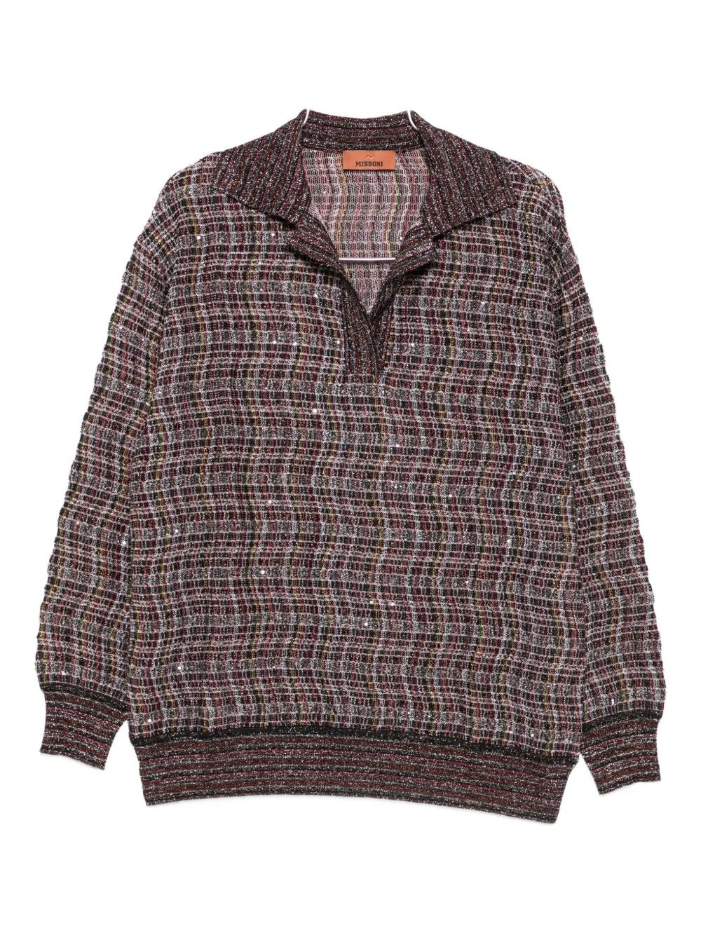 dark brown textured knit polo collar long sleeves ribbed hem The item you receive may differ slightly from the item photographed. This is due to the artisanal nature with which all Missoni products are constructed.