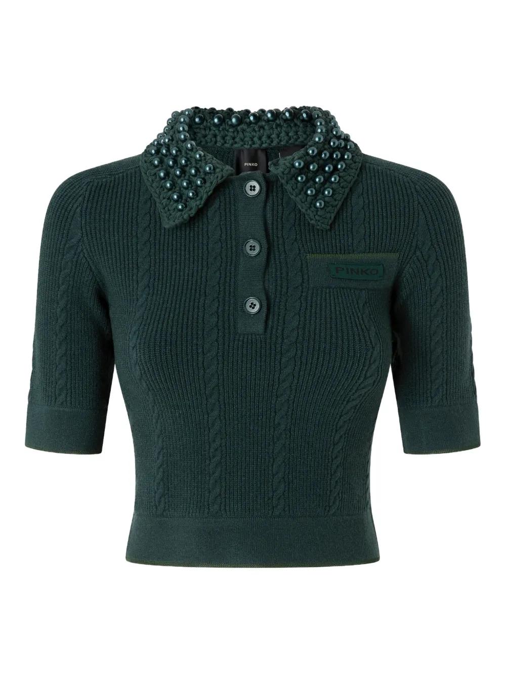 dark green cable knit short sleeves polo collar beaded embellishment button placket