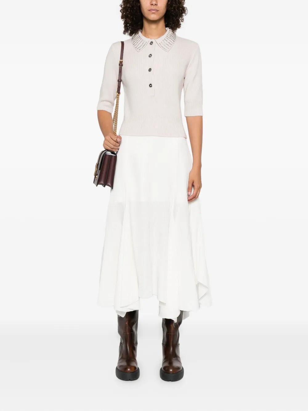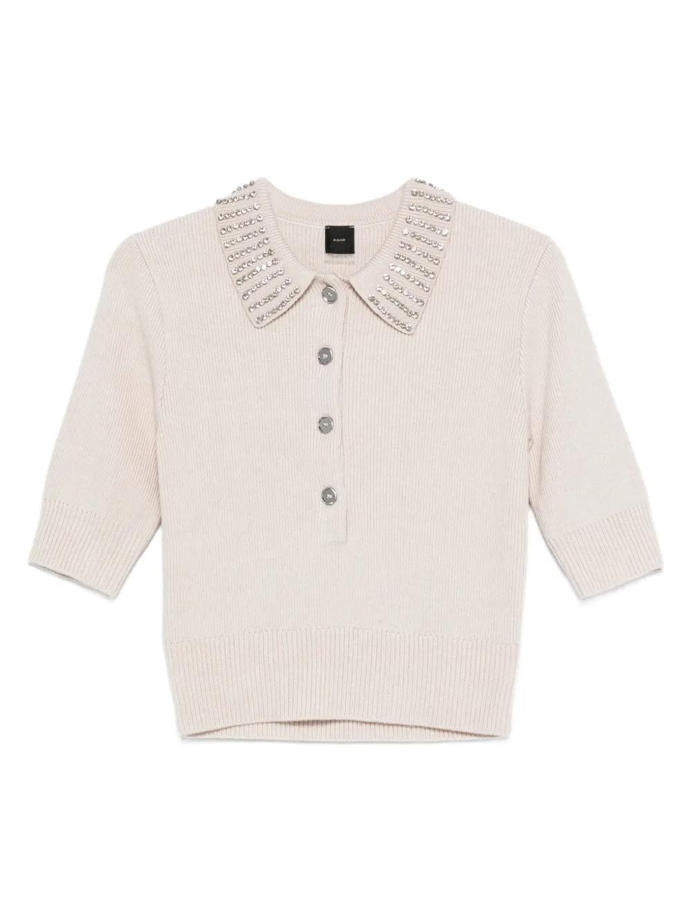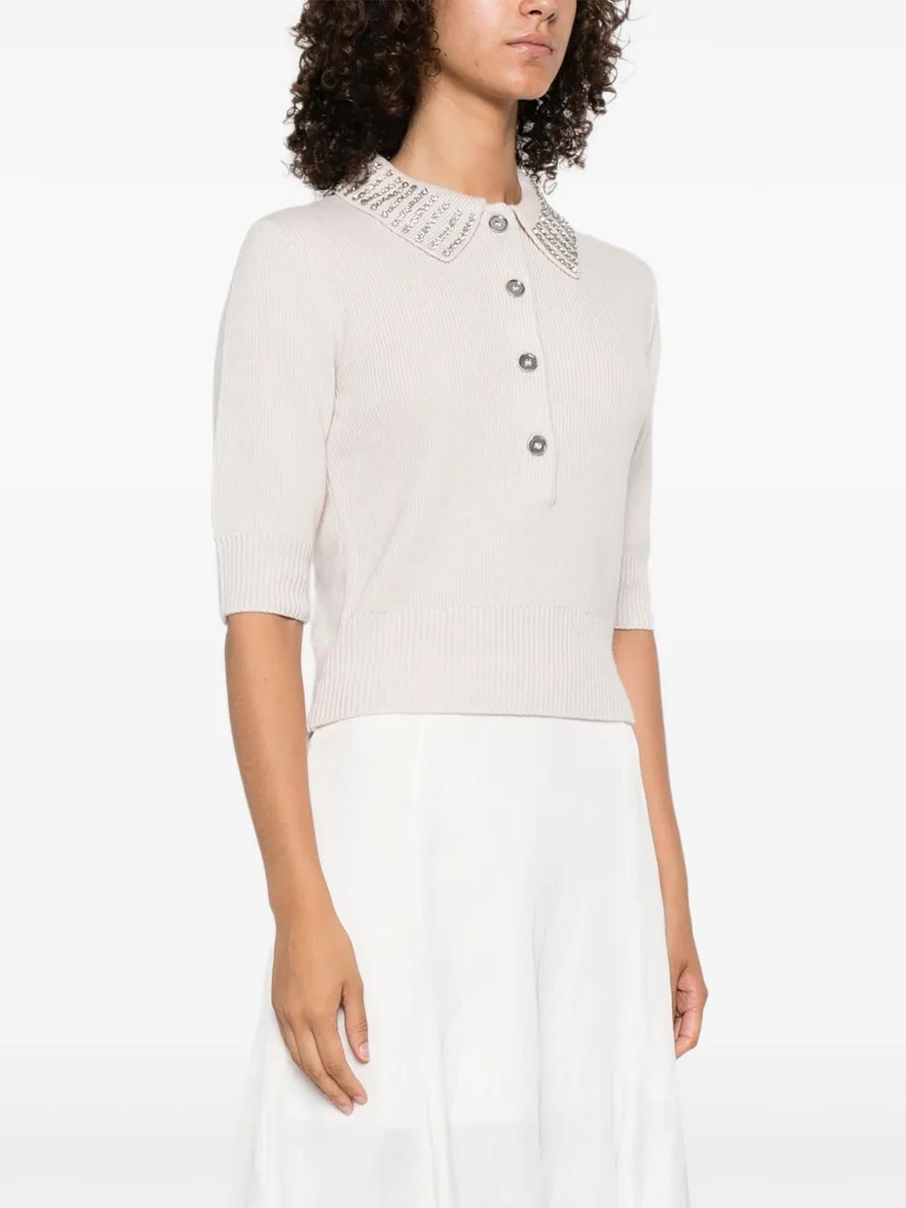grey polo neck embellished collar short sleeves button fastening ribbed knit