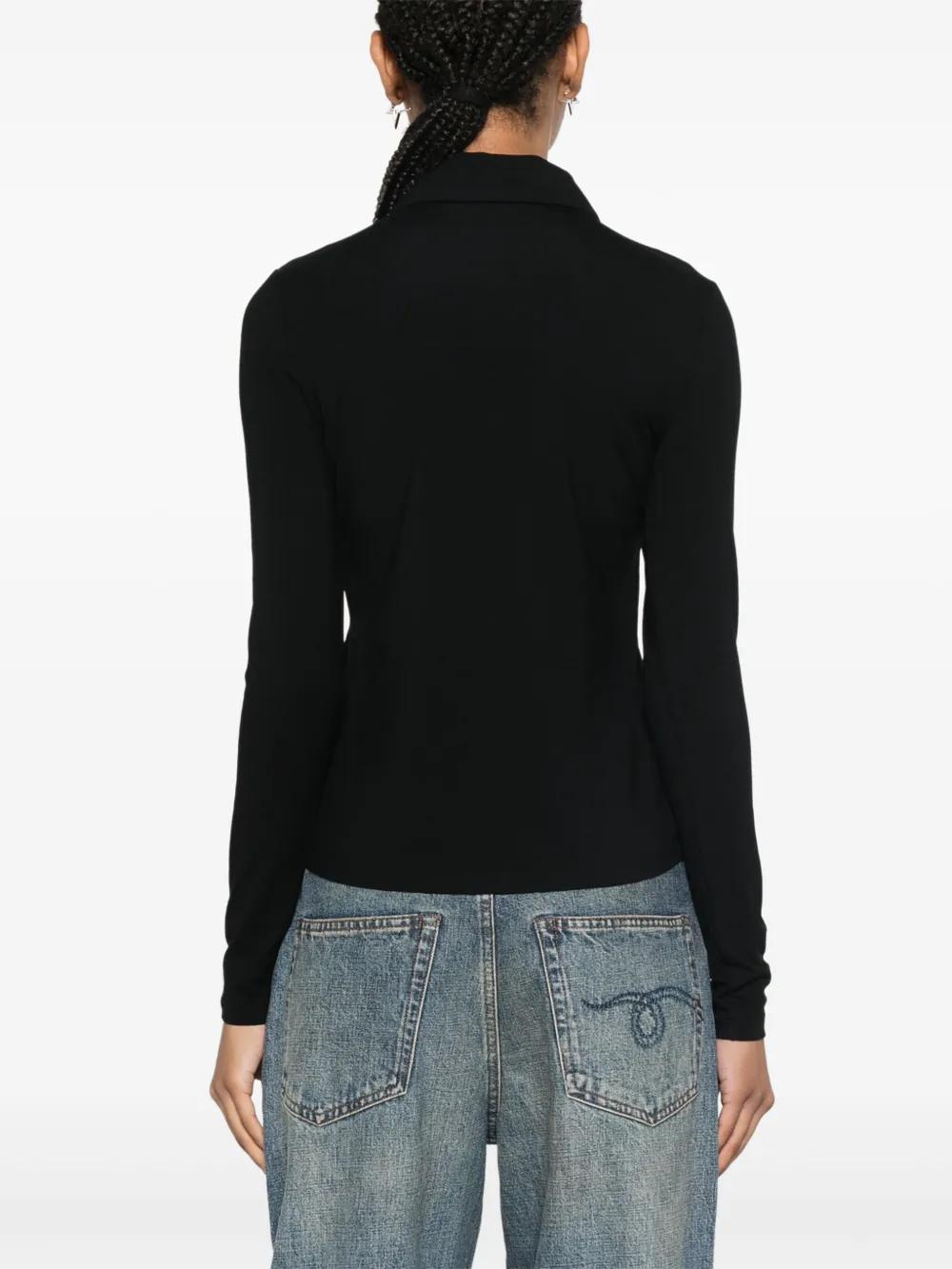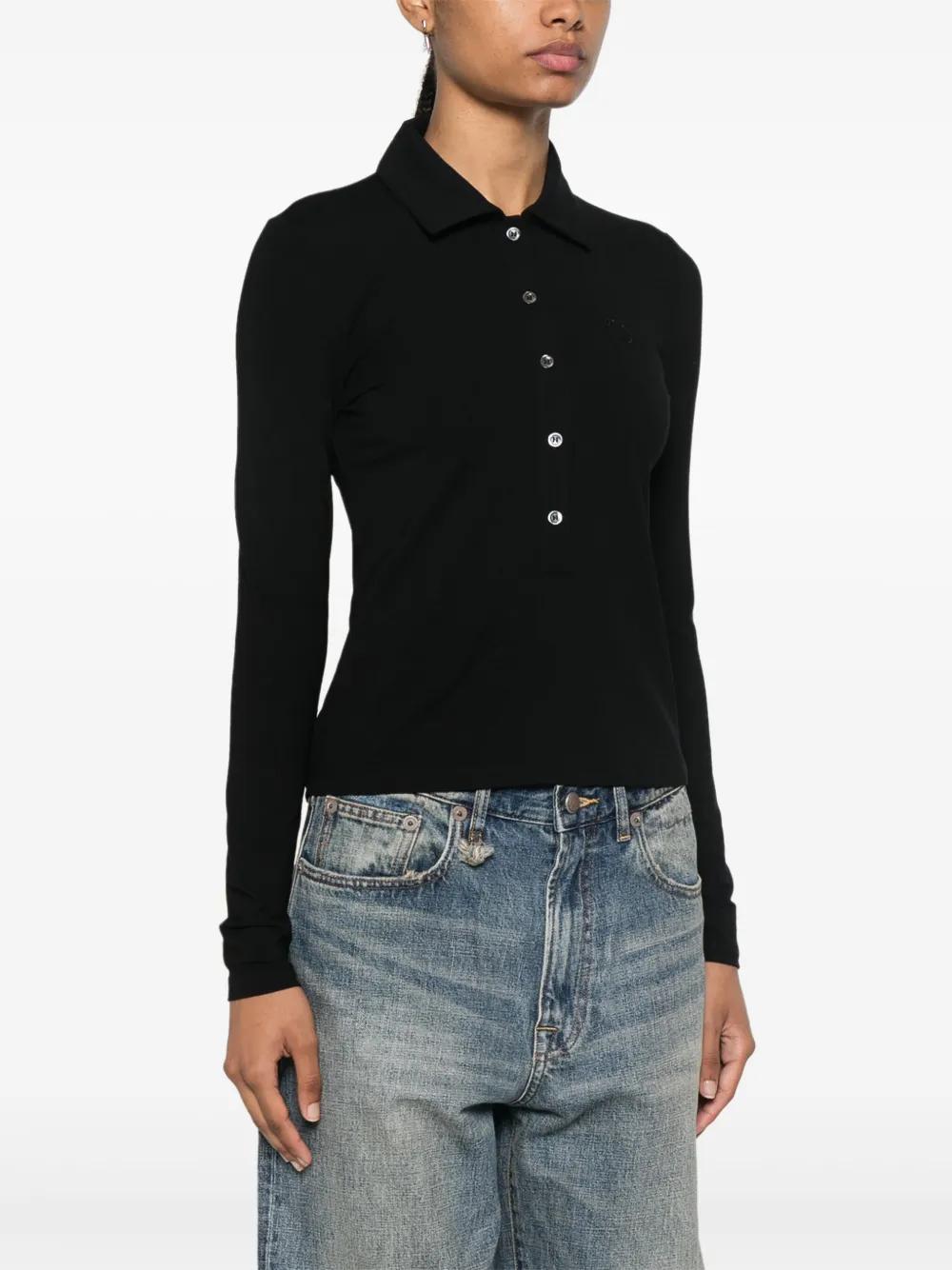 black stretch-design signature Love Birds embroidery polo collar long sleeves straight hem front button placket