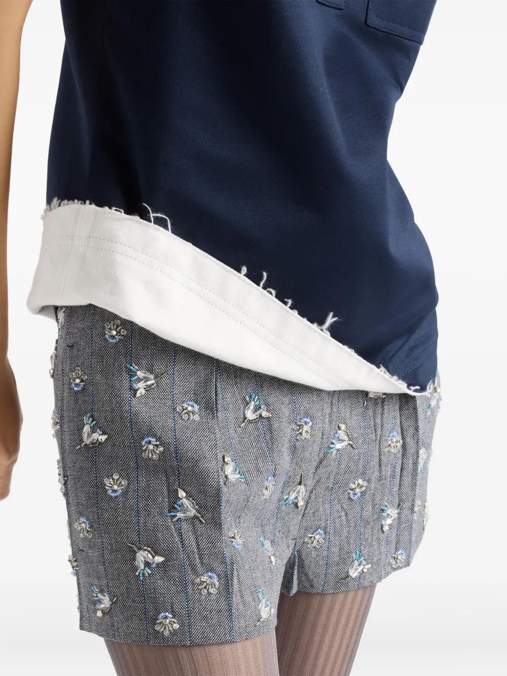 blue shirt collar front button closure short sleeves logo label patch pocket raw-cut hem