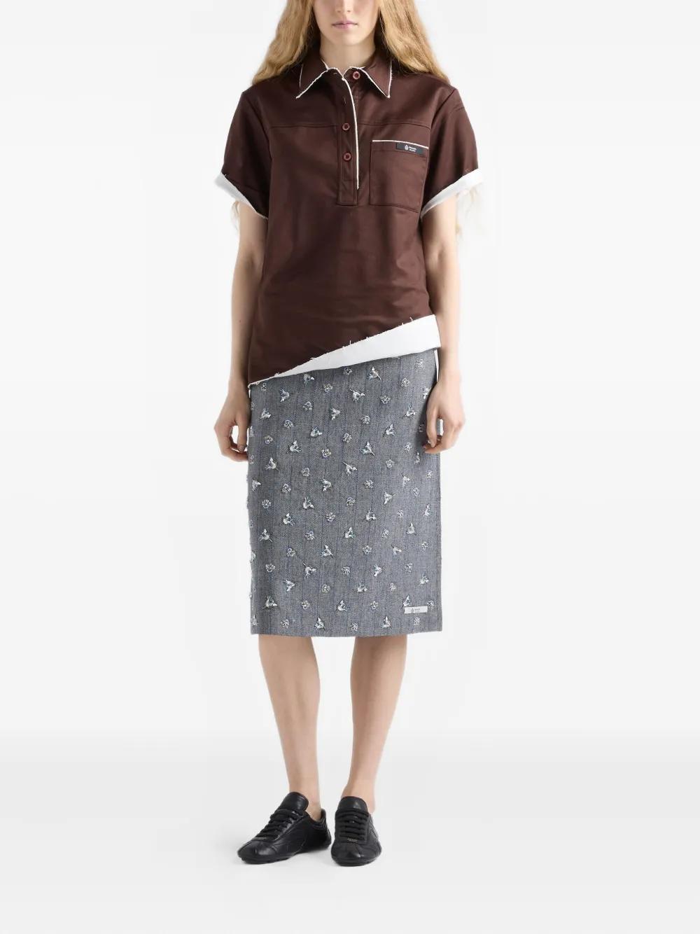 brown polo collar front button closure short sleeves patch pocket logo label raw-cut hem contrasting details