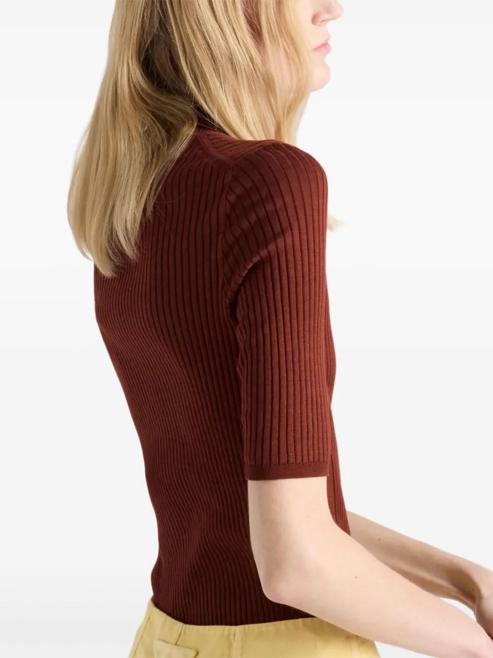 brick red ribbed knit front button placket polo collar short sleeves straight hem