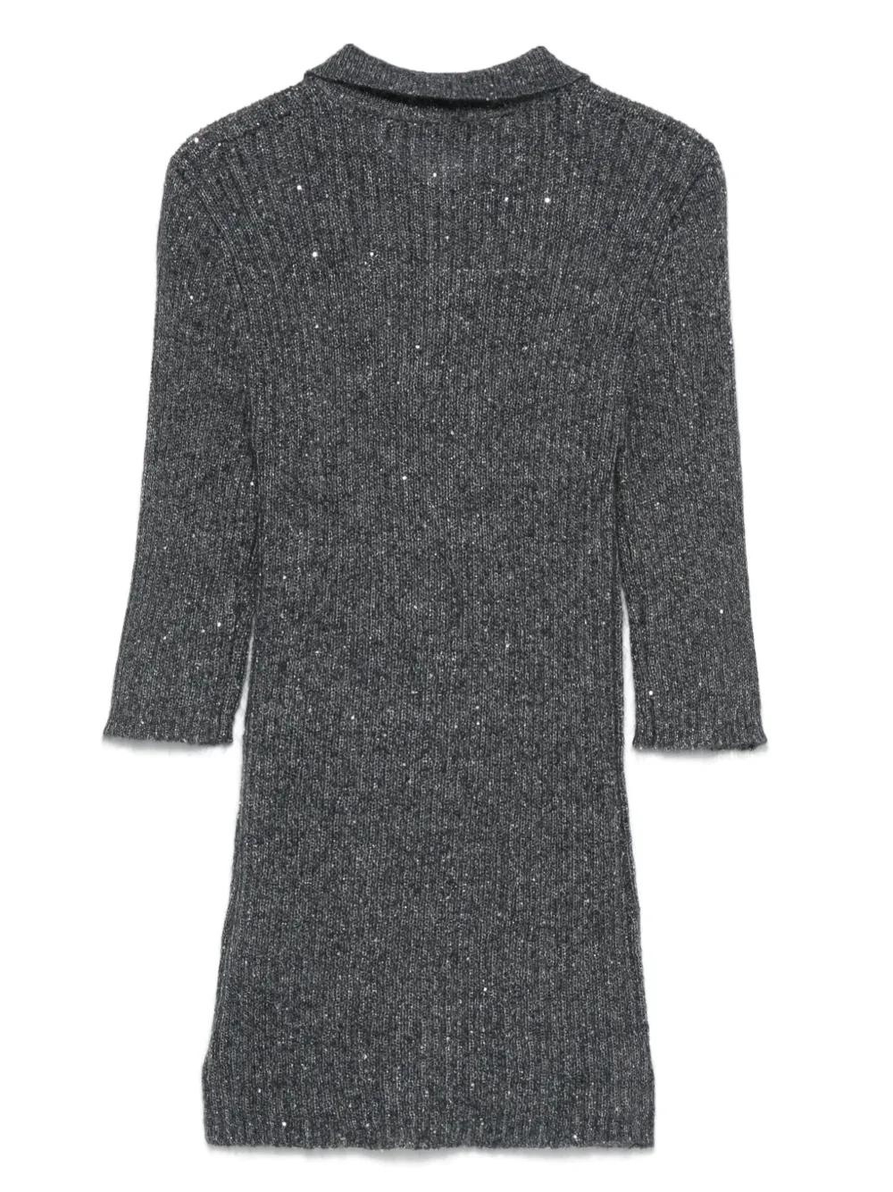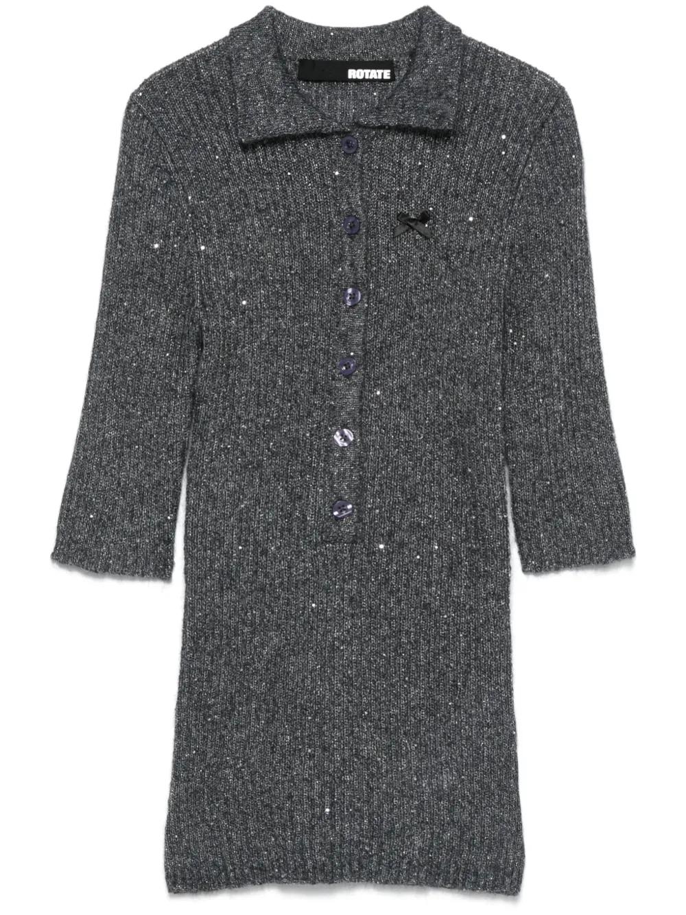 anthracite grey ribbed knit sequin embellishment front button placket polo collar bow detailing half-length sleeves straight hem
