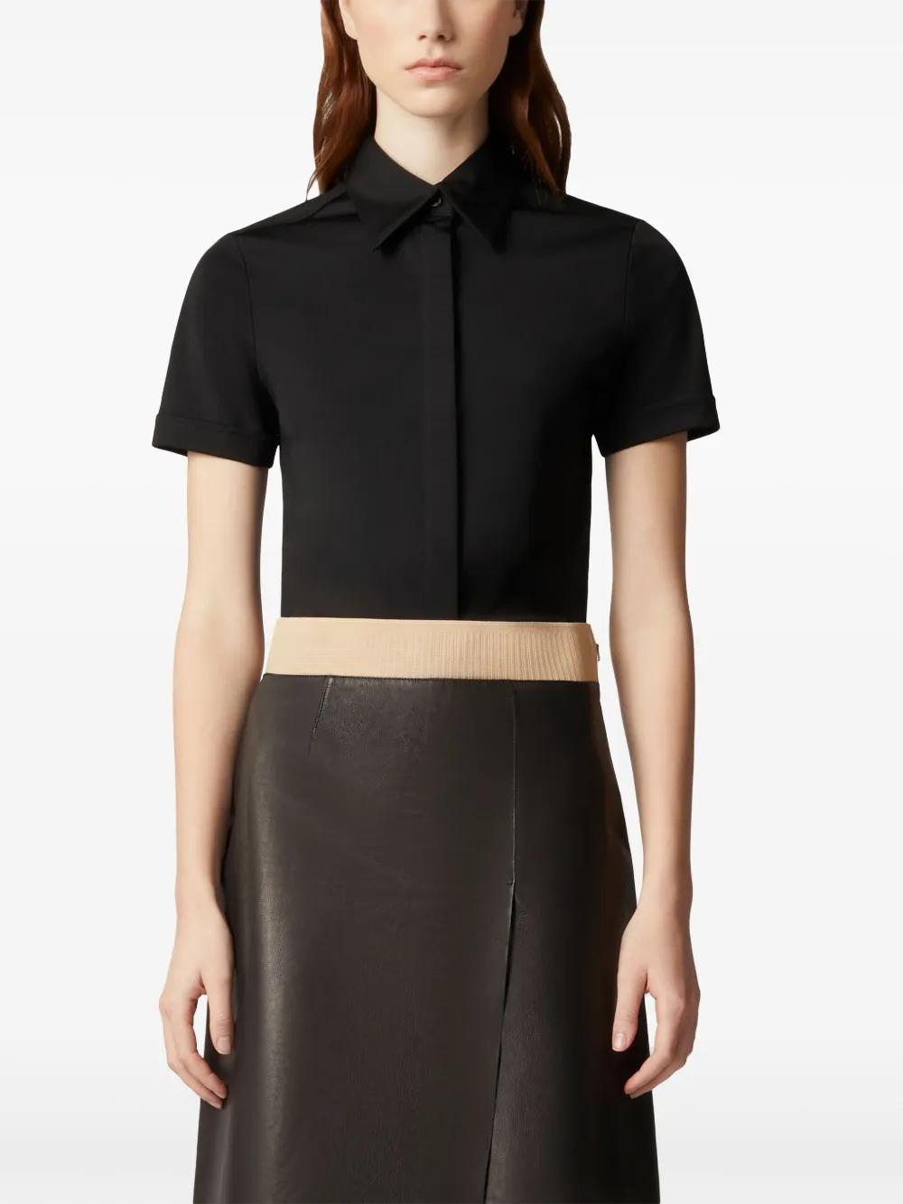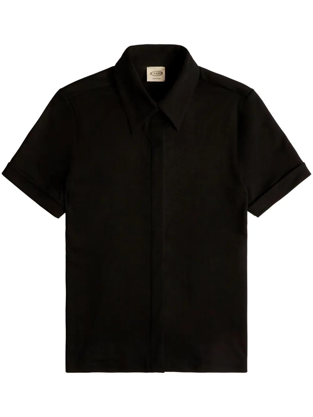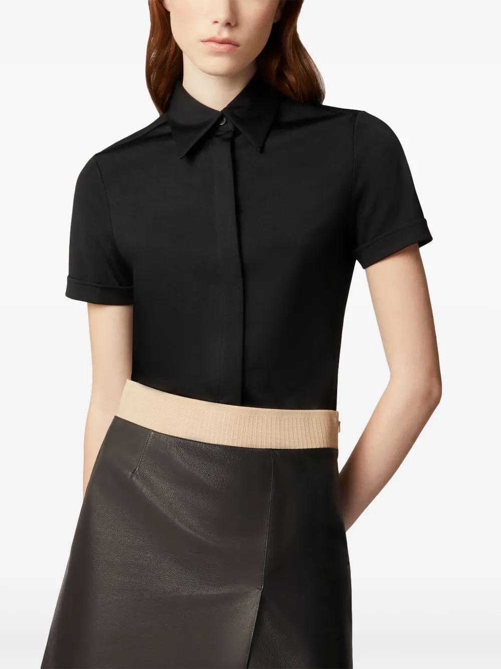 black straight-point collar concealed front fastening short sleeves turn-up cuffs straight hem