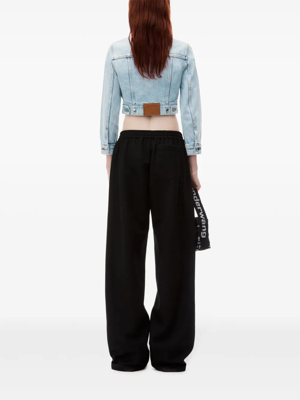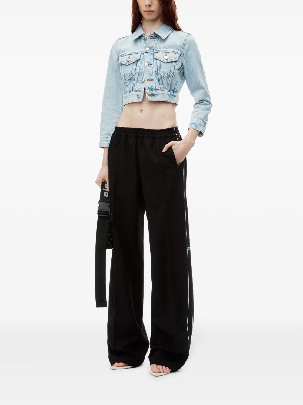 light blue cotton denim light wash contrast stitching classic collar front button fastening chest flap pockets long sleeves buttoned cuffs straight hem cropped