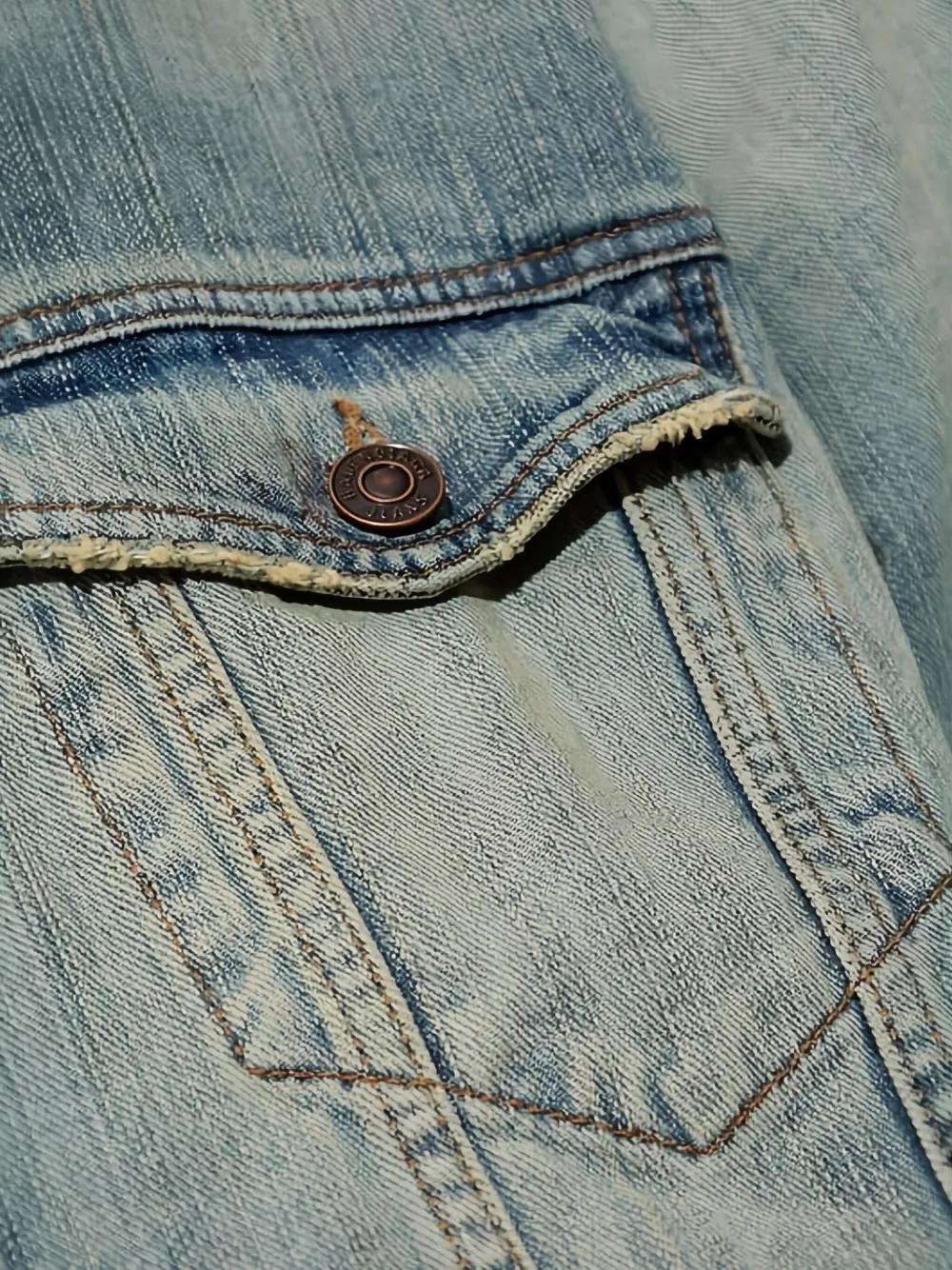 blue distressed detail button fastening flap pockets raw edges back cutout detail