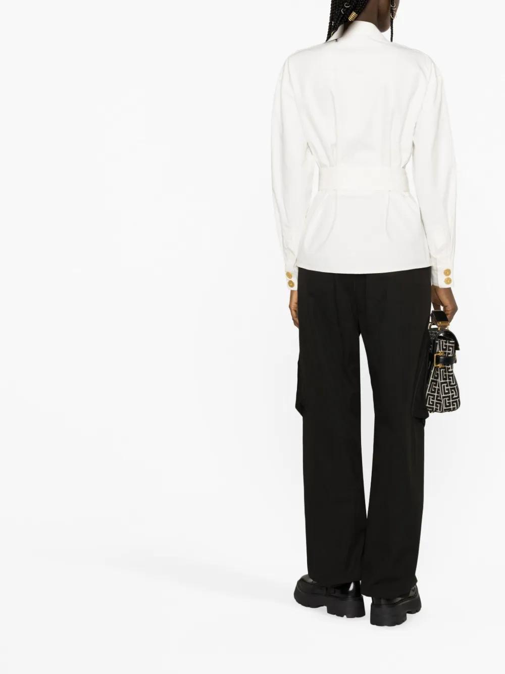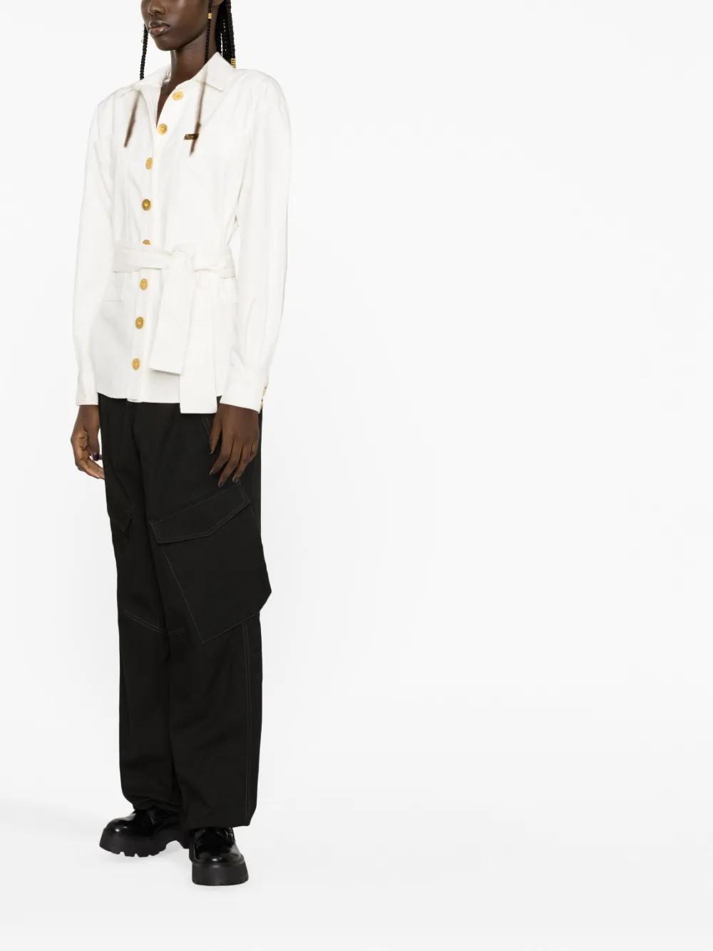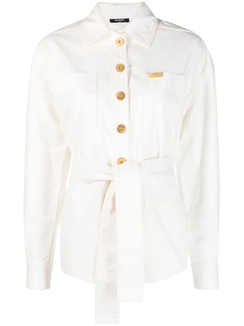 white cotton classic collar embossed gold-tone buttons two chest patch pockets logo plaque self-tie fastening long sleeves two front patch pockets buttoned cuffs straight hem