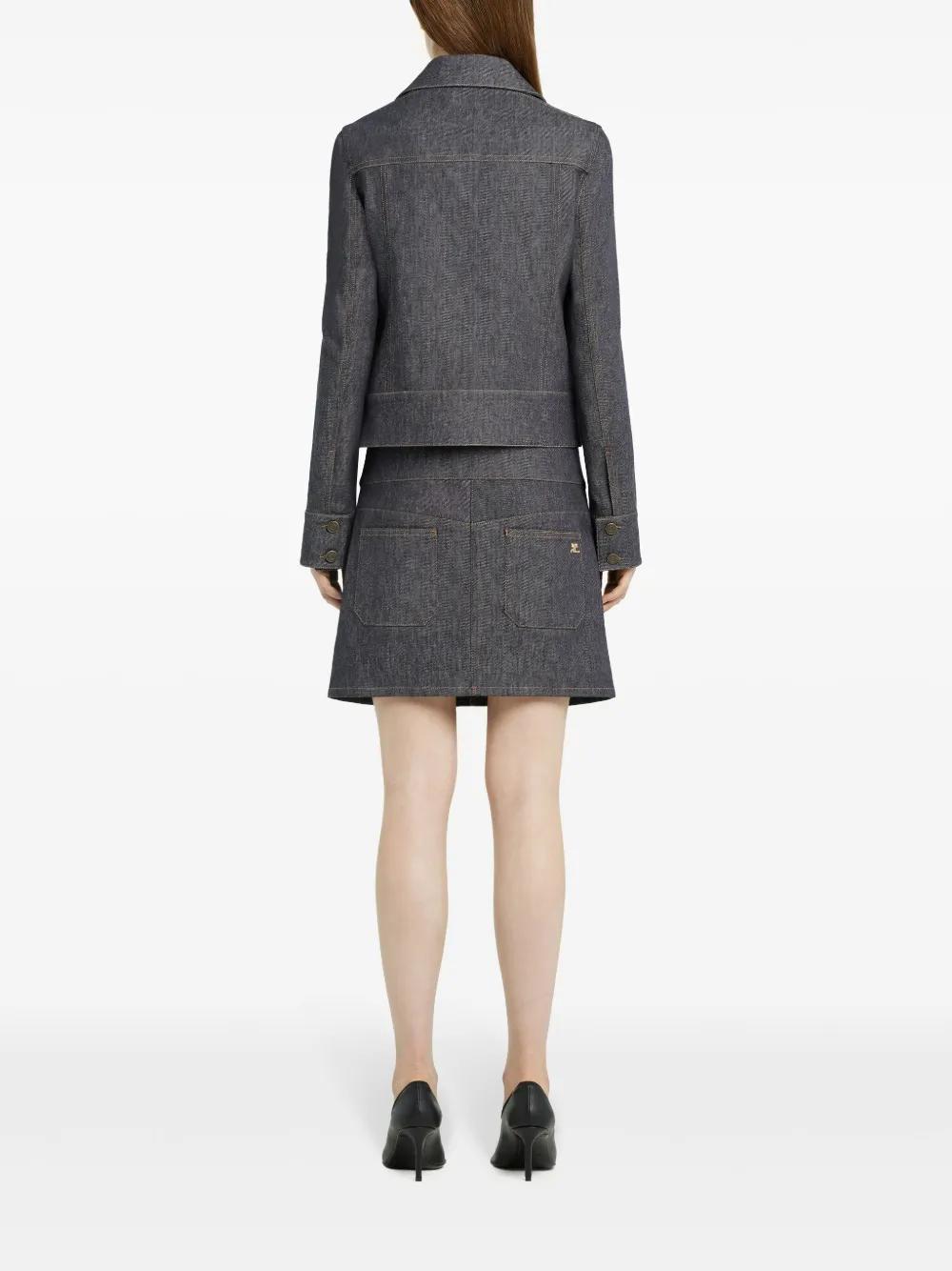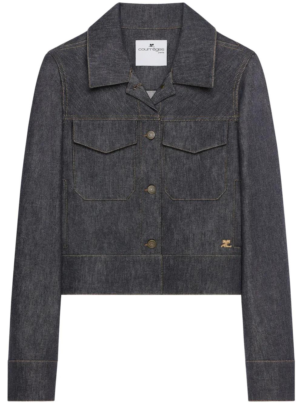 dark grey front button placket buttoned cuffs two chest flap pockets two side welt pockets